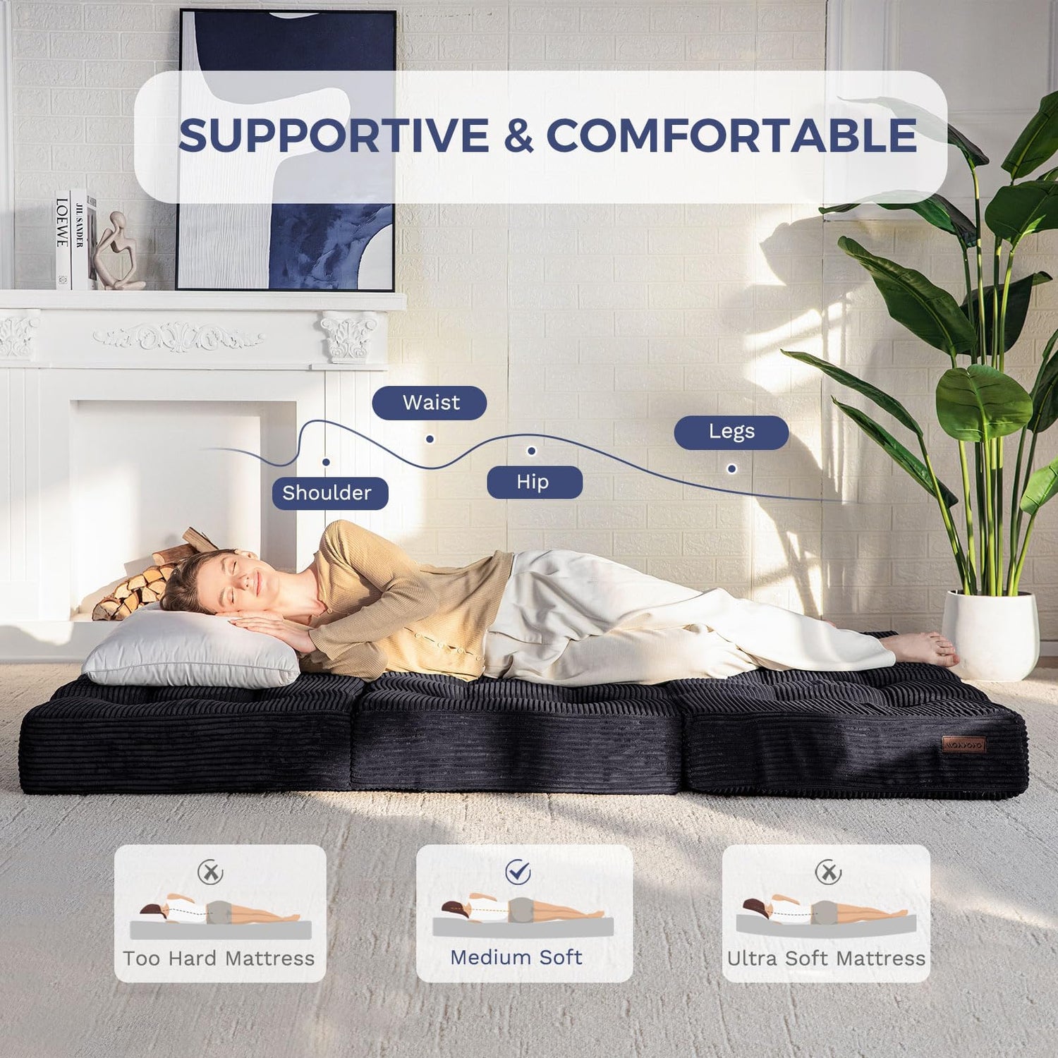 - Tufted Craft Design: The topper of the foldable triple-fold mattress, made of ultra-soft and breathable corduroy fabric on the top, can keep you feeling fresh. The tufted crafting design adds a personalized style to the foldable mattress and also brings fun to your life