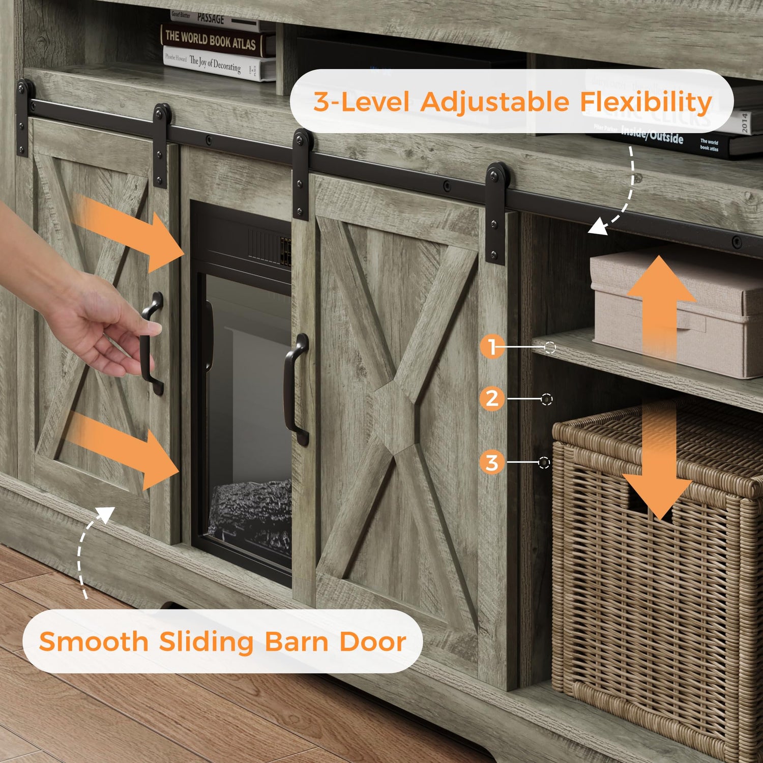 May in Color Fireplace TV Stand for 65+ Inch TV, Farmhouse Entertainment Center with 23" Electric Fireplace with Remote, Modern Rustic TV Console with Sliding Bar Door for Living Room,Light Grey