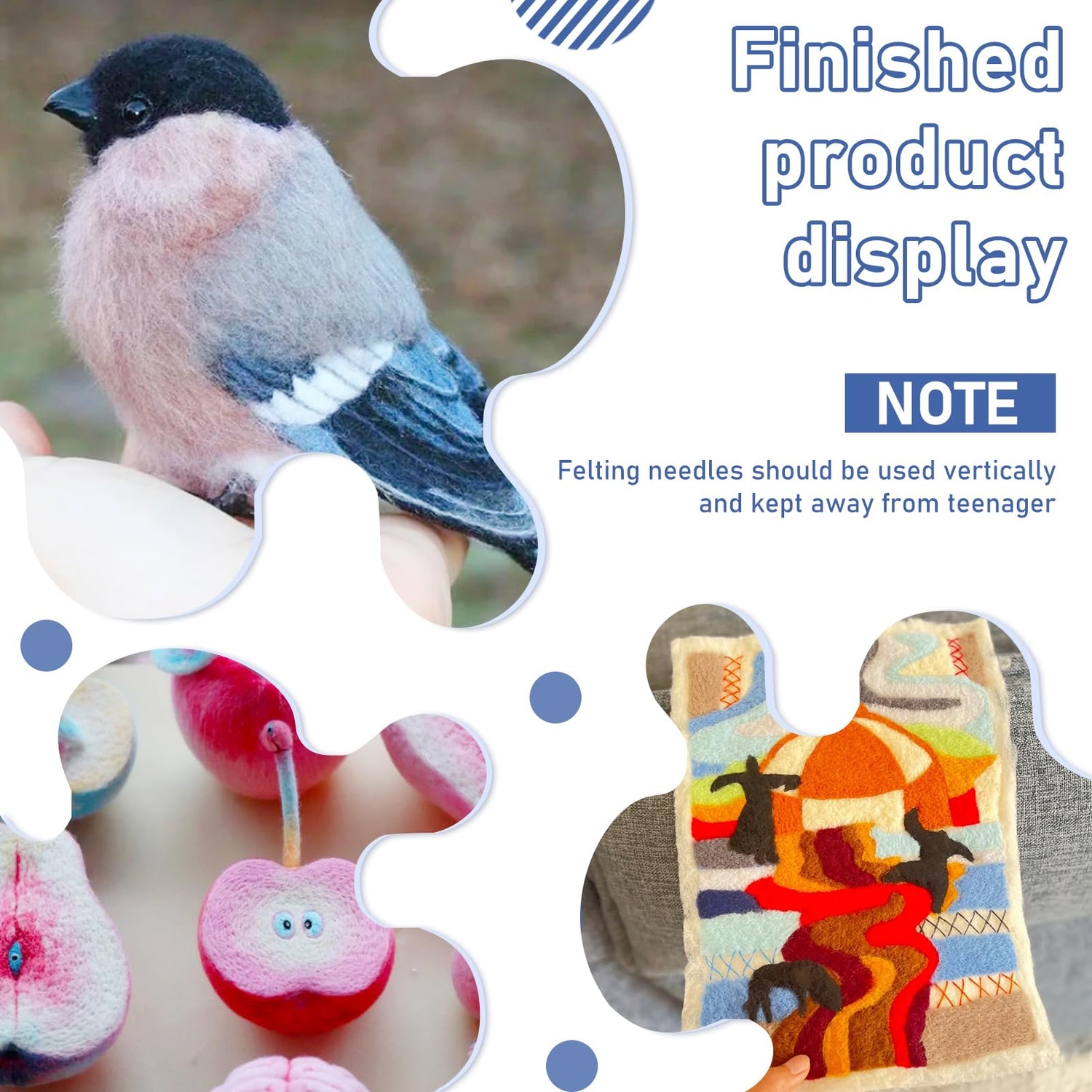 - Practical Felt Tool Set: Contains a felt pad, 40 felt needles(10pcs 36gauge, 10pcs 38gauge, 15pcs 40gauge, 5pcs 40gauge), 3pcs star felting needles,4pcs cone felting needles,4pcs spiral felting needles,1 single needle handle,1 pair of finger cots, 1 rag (for oil on needles ), etc..a bag for all felting felting tools