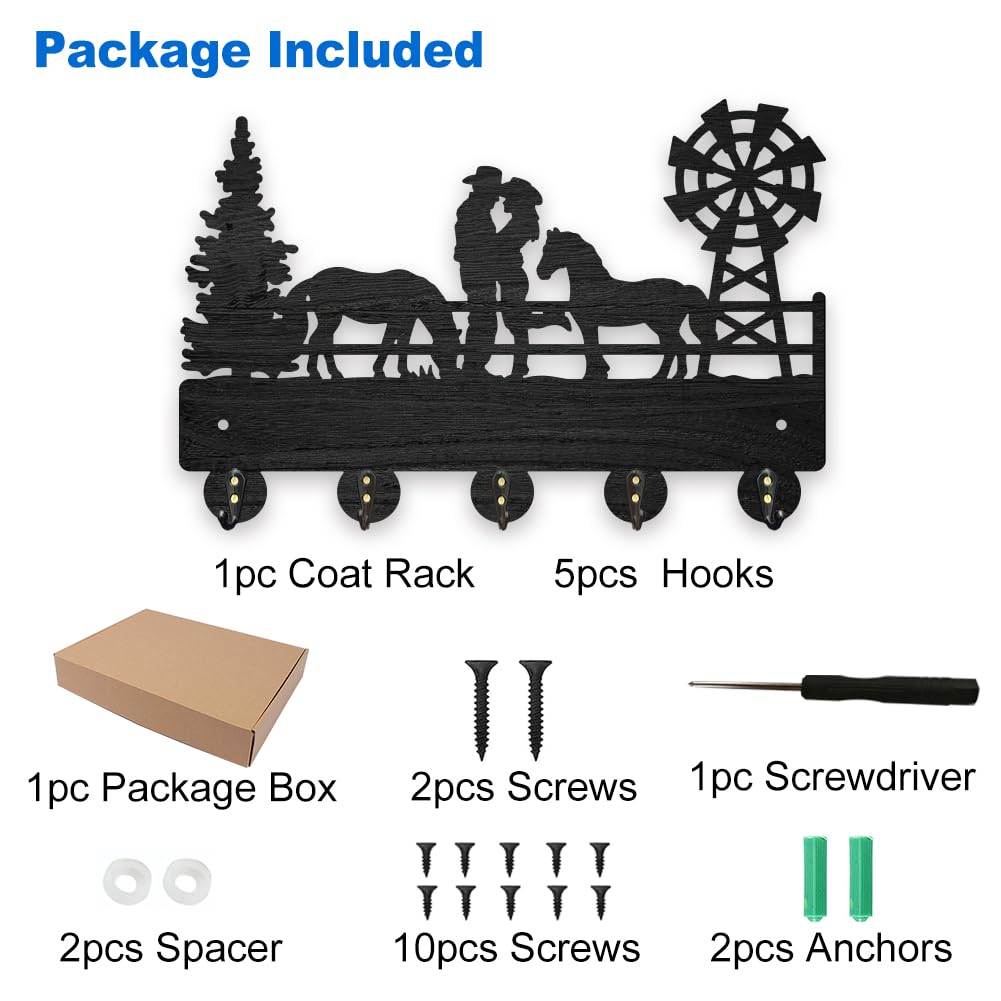 MAYJOYDIY Wood Cowboy Horse Farm Coat Hooks Farmhouse Cowgirl Windmill Key Holder for Wall 11.8×7.9inch Wall Art Decor Gift Black Wall Key Rack Organizer 5 Alloy Hooks for Bedroom Kitchen Entryway