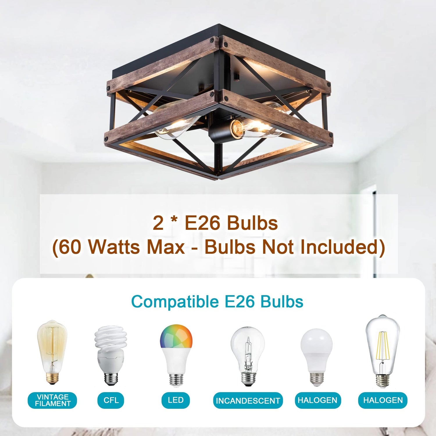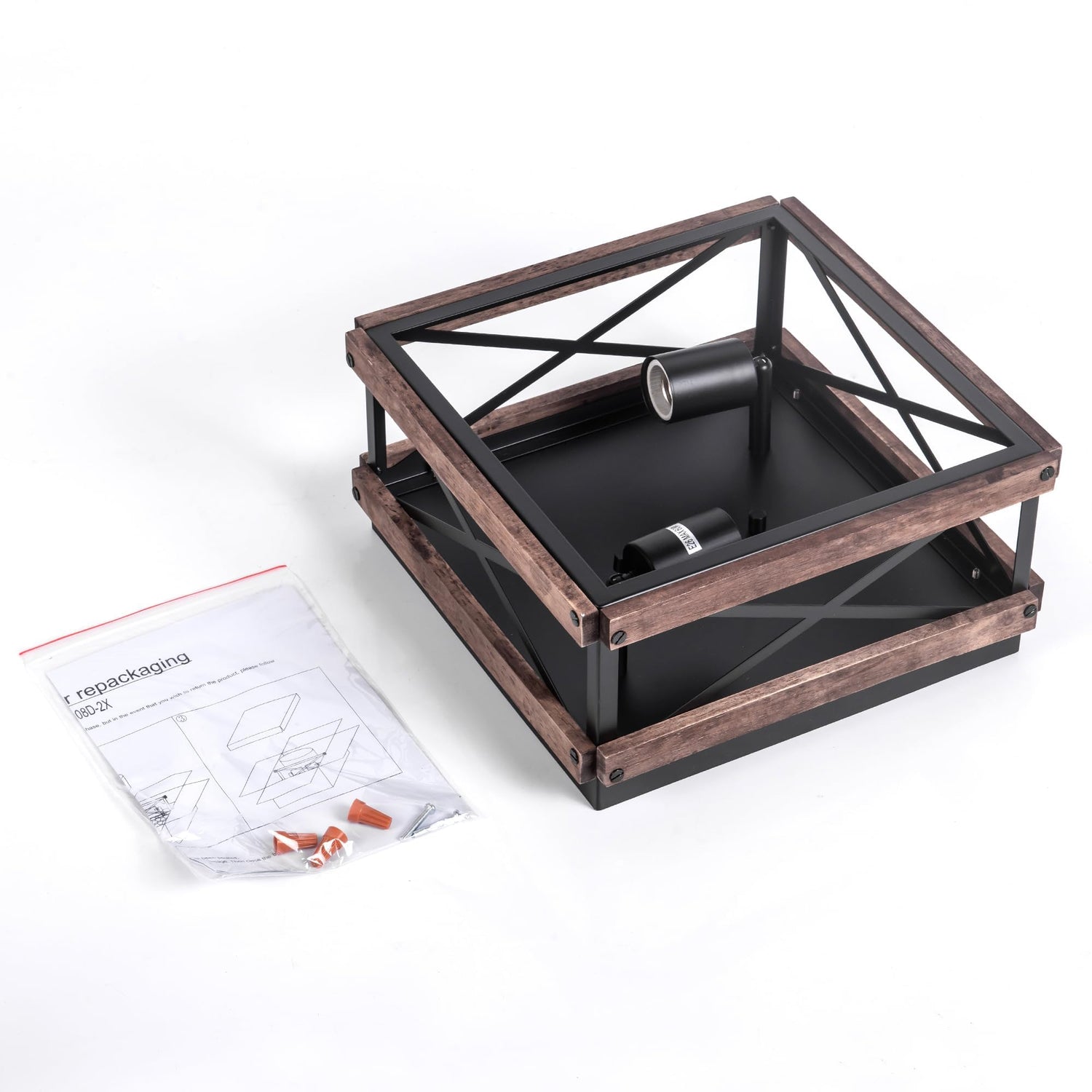MAYNA 2-Light Industrial Ceiling Light Fixtures, Farmhouse Flush Mount Ceiling Light, Metal and Wood Square Dining Room Light Fixture for Hallway Bedroom Balcony Farmhouse,Black