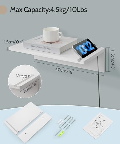 - 【Unique Storage Solutions】With its unique design, this 16-inch floating nightstand combines modern convenience with practicality. The grooved slot is perfect for easily accessing your phone, eliminating bedside clutter. The holes underneath neatly organize charging cables, keeping your bedside tidy and enhancing both functionality and aesthetics