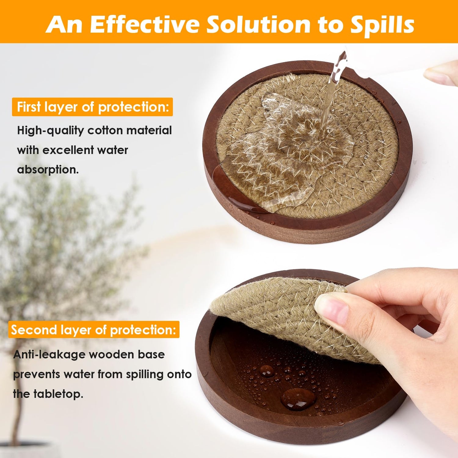 - Wood & Cotton Coasters for Drinks: The absorbent coaster set contains 6 coasters and 1 holder. Our new cotton and wood 2-in-1 coaster is unique and can be used on its own. If both are used at the same time, they will have double the water absorption effect and better protect the furniture. Using these 2-in-1 coasters will make your experience even more comfortable.