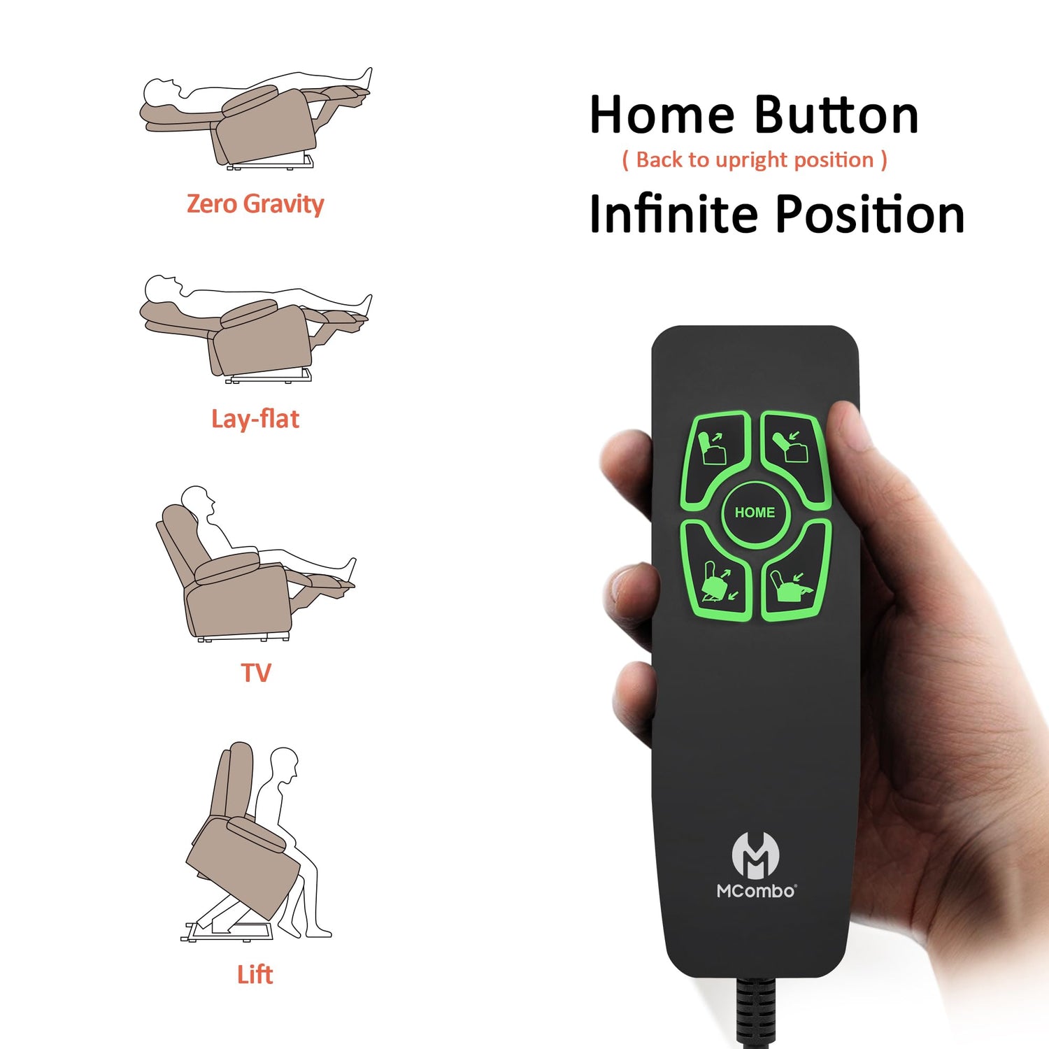 - HOME Button for Quick Return. When someone knocks on the door, you only need to press the HOME button on the remote and you will return to the sitting upright position in a maximum of ''16'' seconds. When the reclining position is raised, the power lift recliner's back will move first to ensure your safety