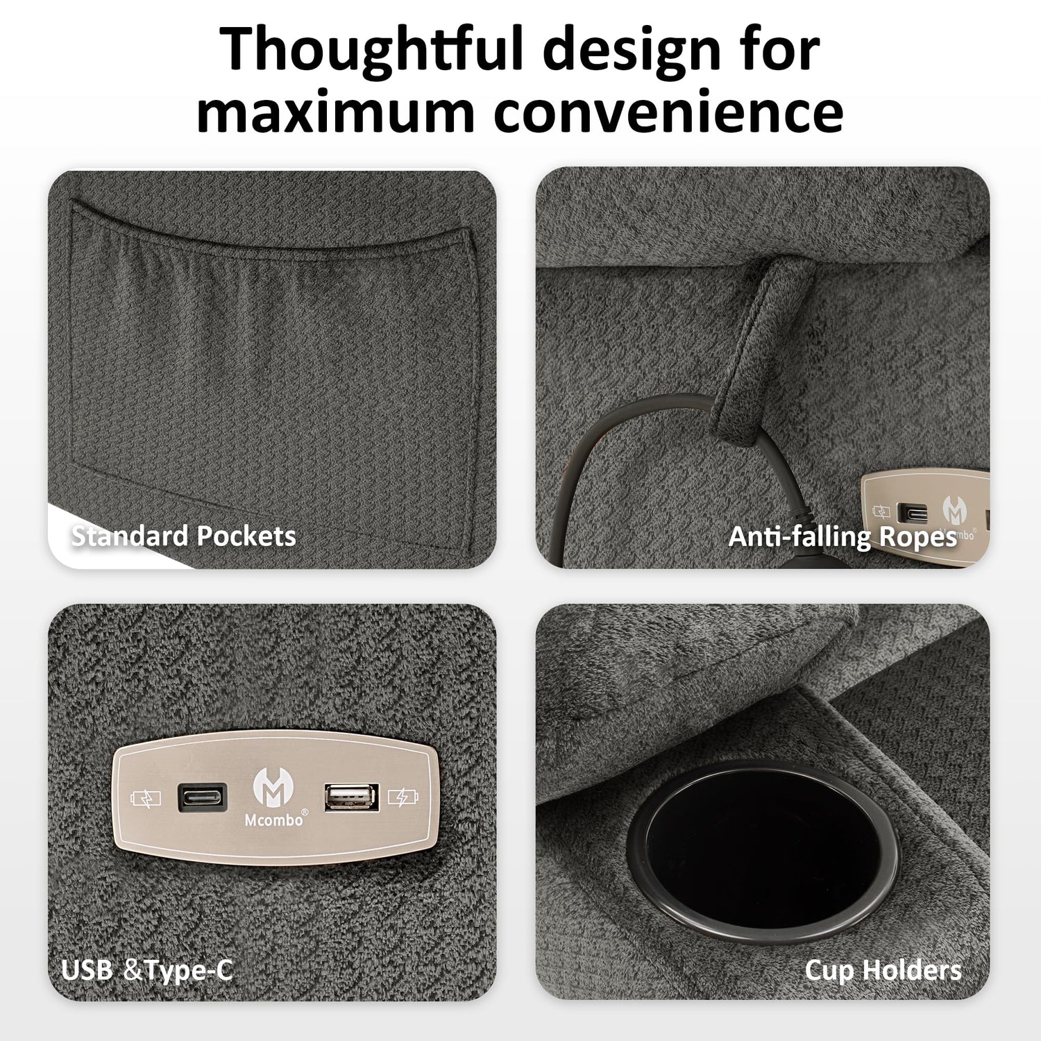 MCombo Large Triple Motor Power Lift Recliner Chair with Massage and Heat for Elderly People, Adjustable Headrest, Infinite Position, USB Ports, Fabric 7662 (Grey, Large)