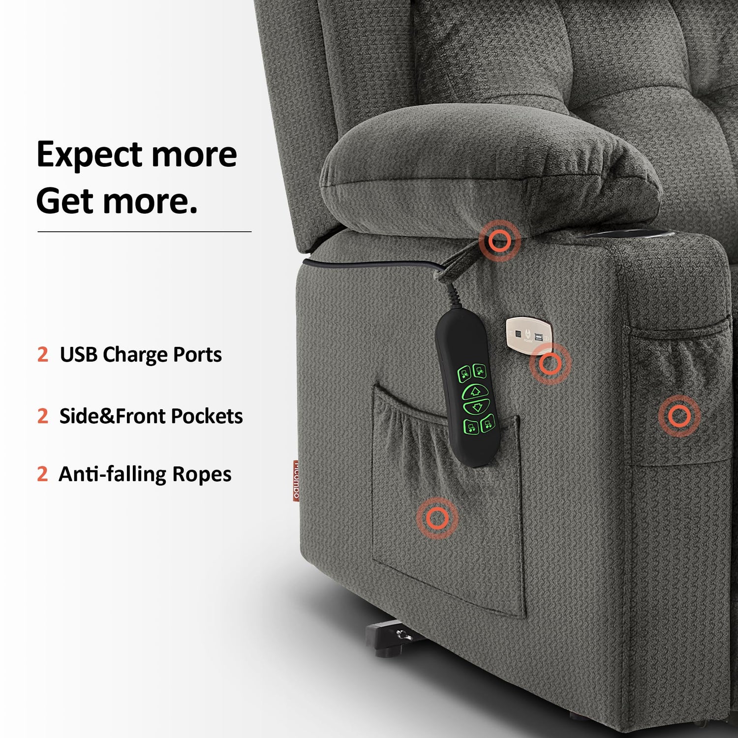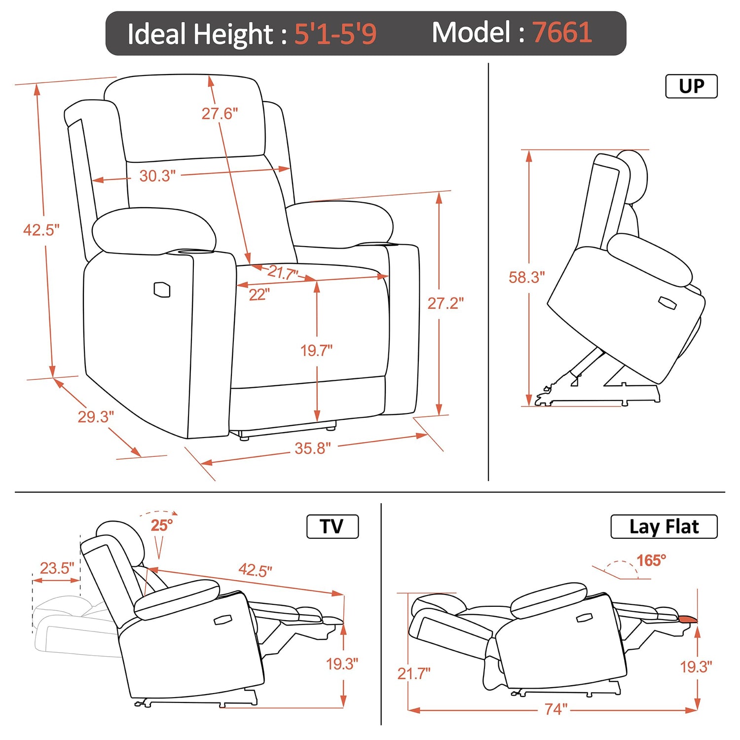 - Infinite Position: Since the built-in dual motor, you can adjust the backrest and footrest independently to the infinite position you want, lift, TV and lay-flat (Max reclining angle: 165°)