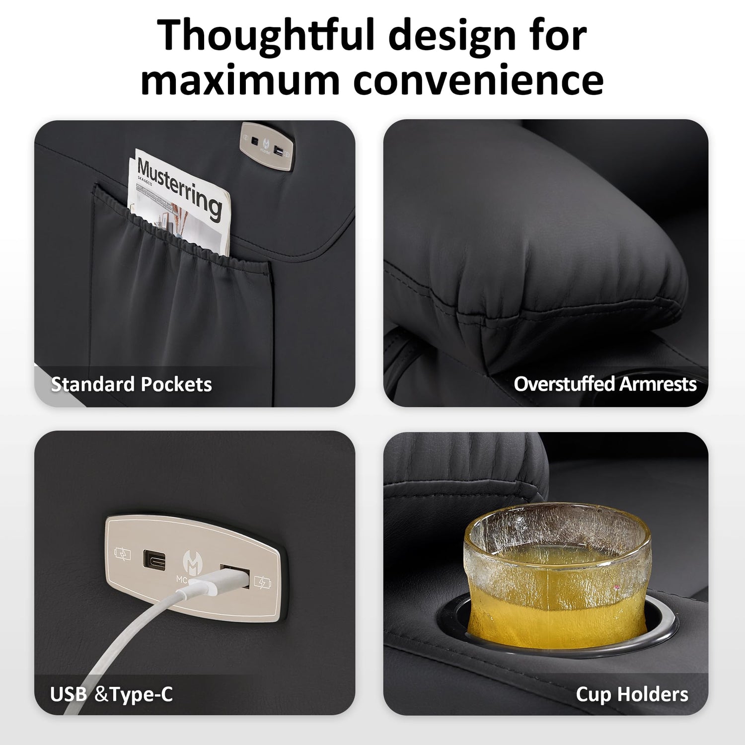 - Convenient Everyday Features: Includes a 3.9" deep cup holder, two charge ports (USB & Type-C), and multiple storage pockets, keeping drinks, devices, and essentials within easy reach