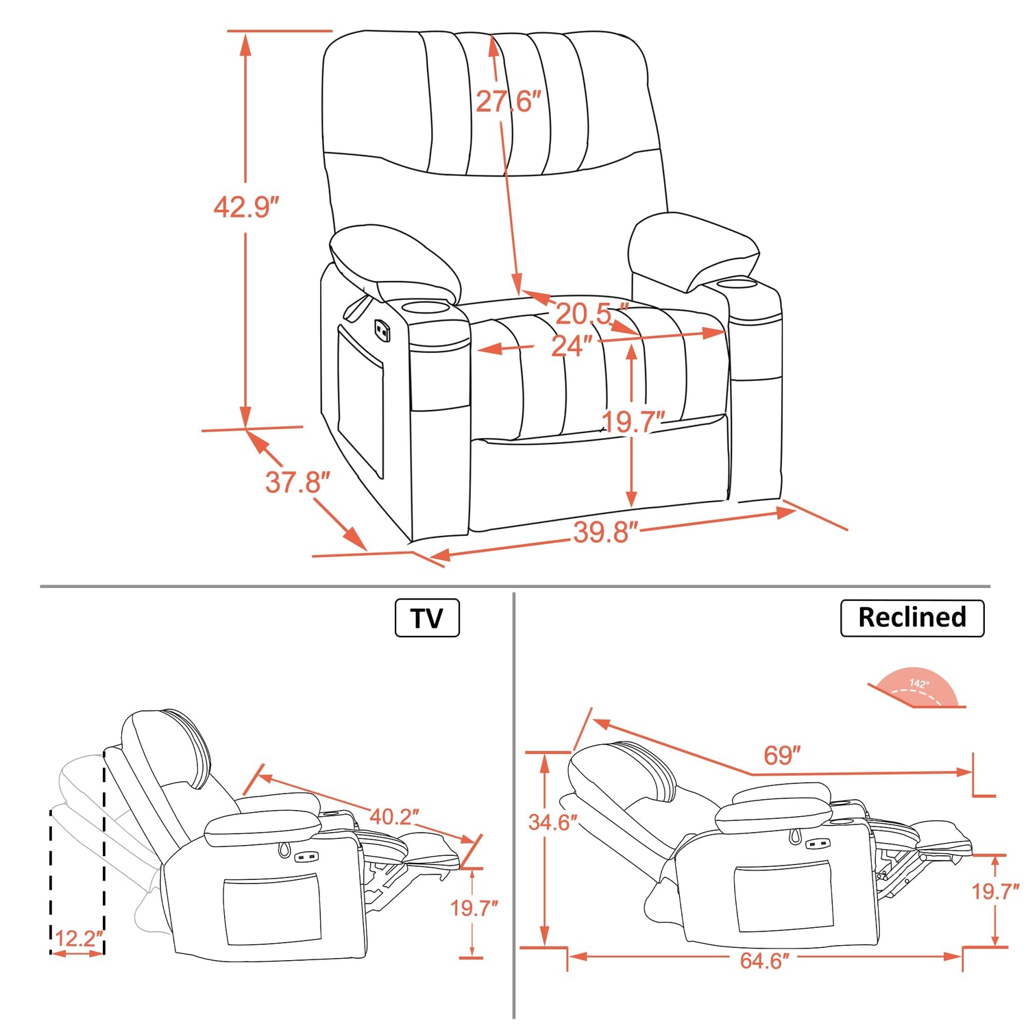 - USB Ports, Pockets, Cup holders: Keep devices, magazines and drinks at your fingertips. USB ports charge low-power devices without leaving the comfort of overstuffed recliner