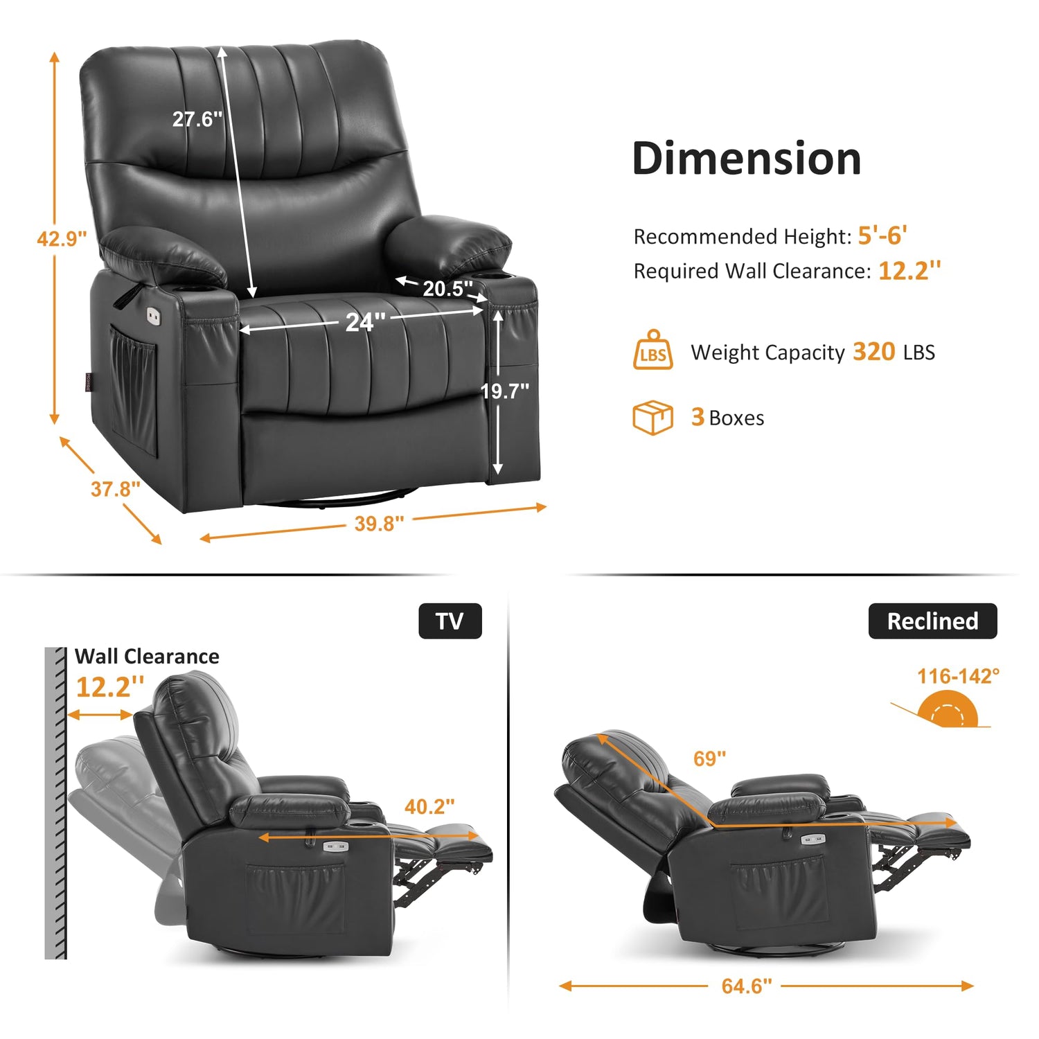 - Power swivel glider rocker recliner: Swivels 270°, glides smoothly, electric reclining up to 142°, a suitable choice for the living room and a great addition to the nursery