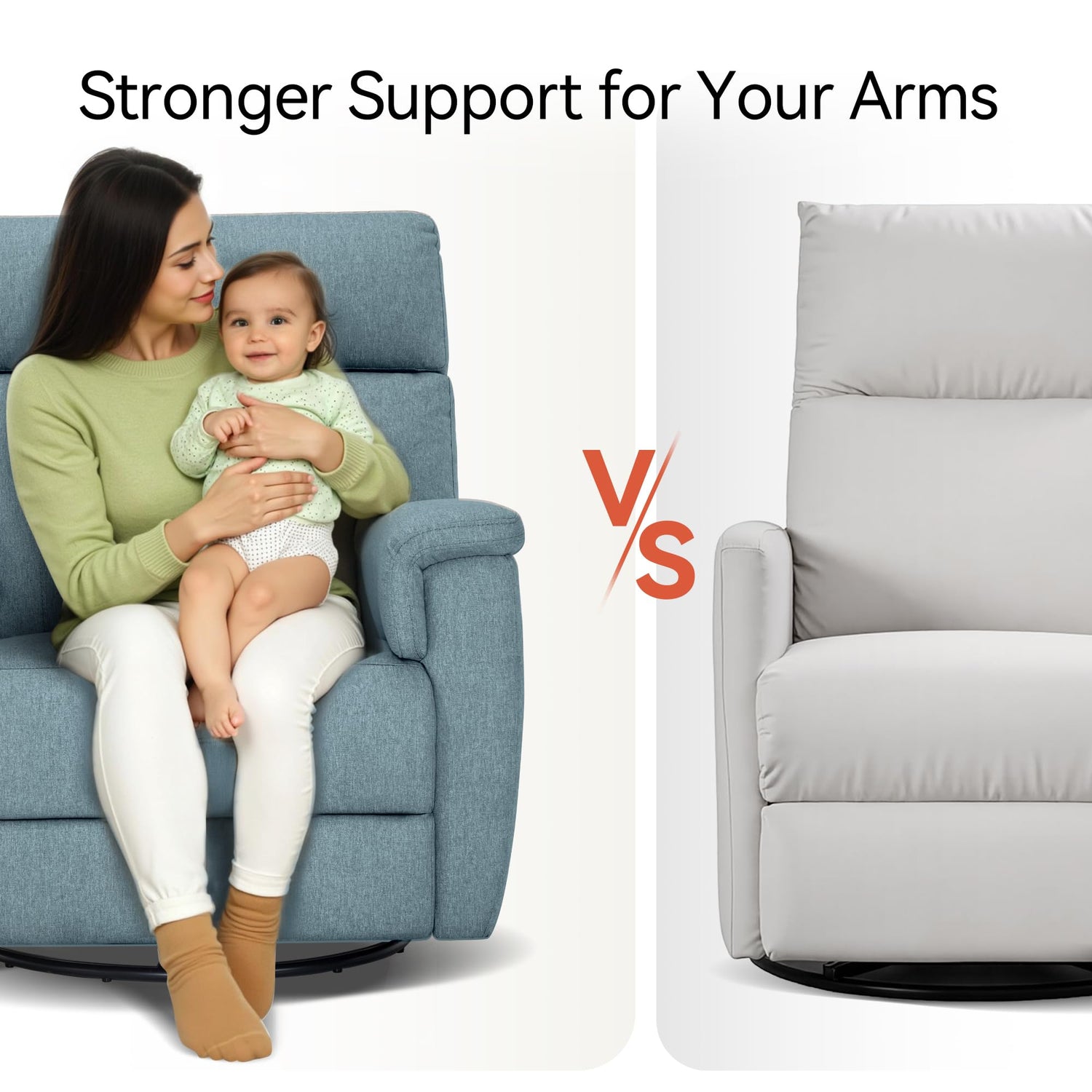 - Nursery Swivel Glider Recliner: Designed for effortless comfort, this glider recliner combines a whisper-quiet gliding motion to soothe your baby gently, along with a 270° swivel function that allows you to easily change directions or repositioning without needing to move the chair