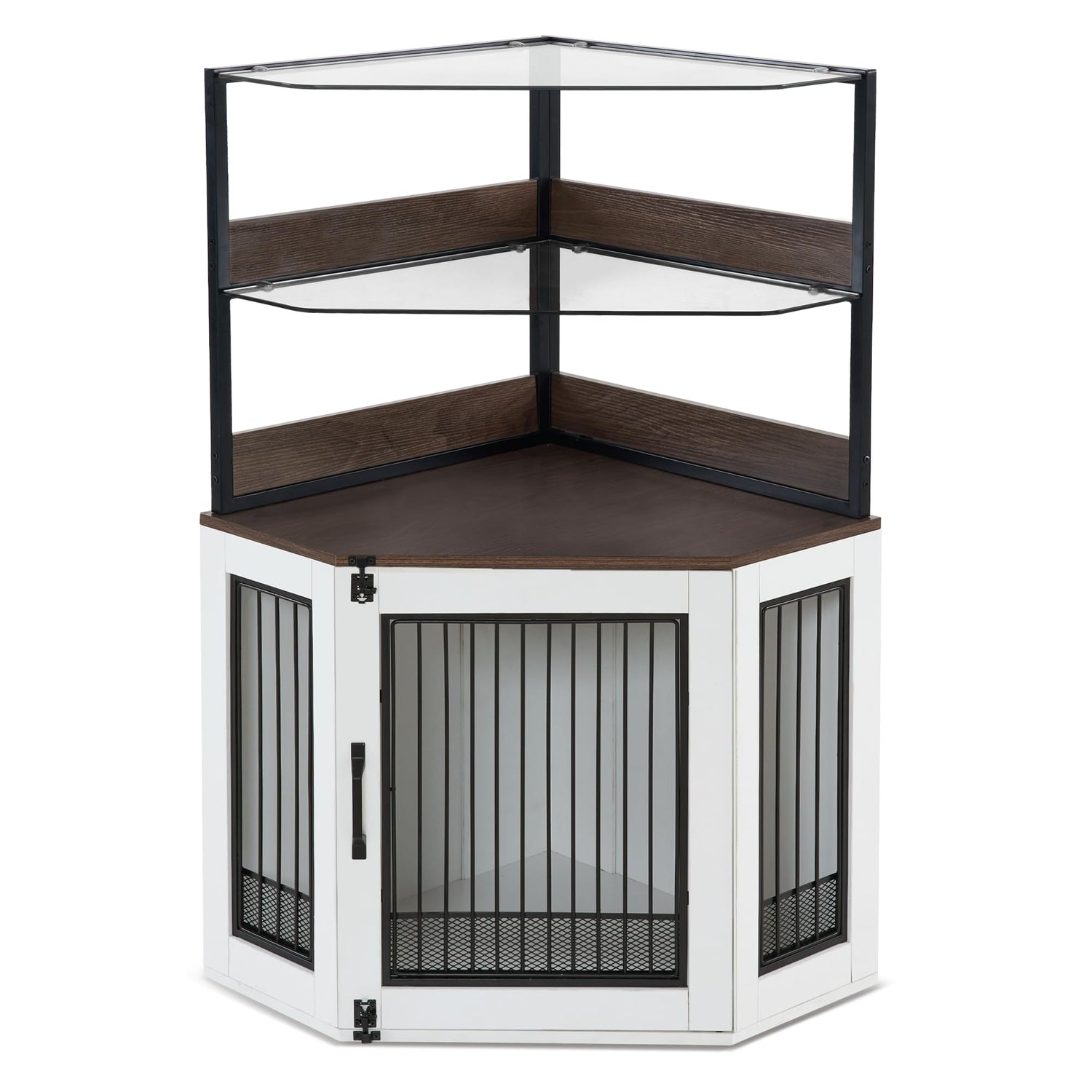 MCombo Small Corner Dog Crate Furniture with Glass Shelves, Wooden Dog Kennel Furniture with Door, Pet Crate Indoor Use, CN17 (White and Brown)