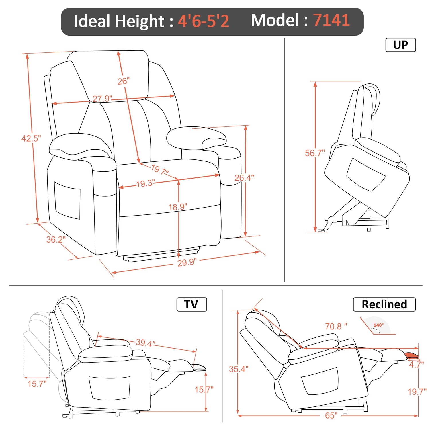 - Small Sized Power Lift Recliner: The right-sized chair will be as perfectly-sized as your shadow and specifically tailored for Petite People. The seat dimensions are smaller to accommodate shorter heights. (Recommended Height: 4'6"-5'2")