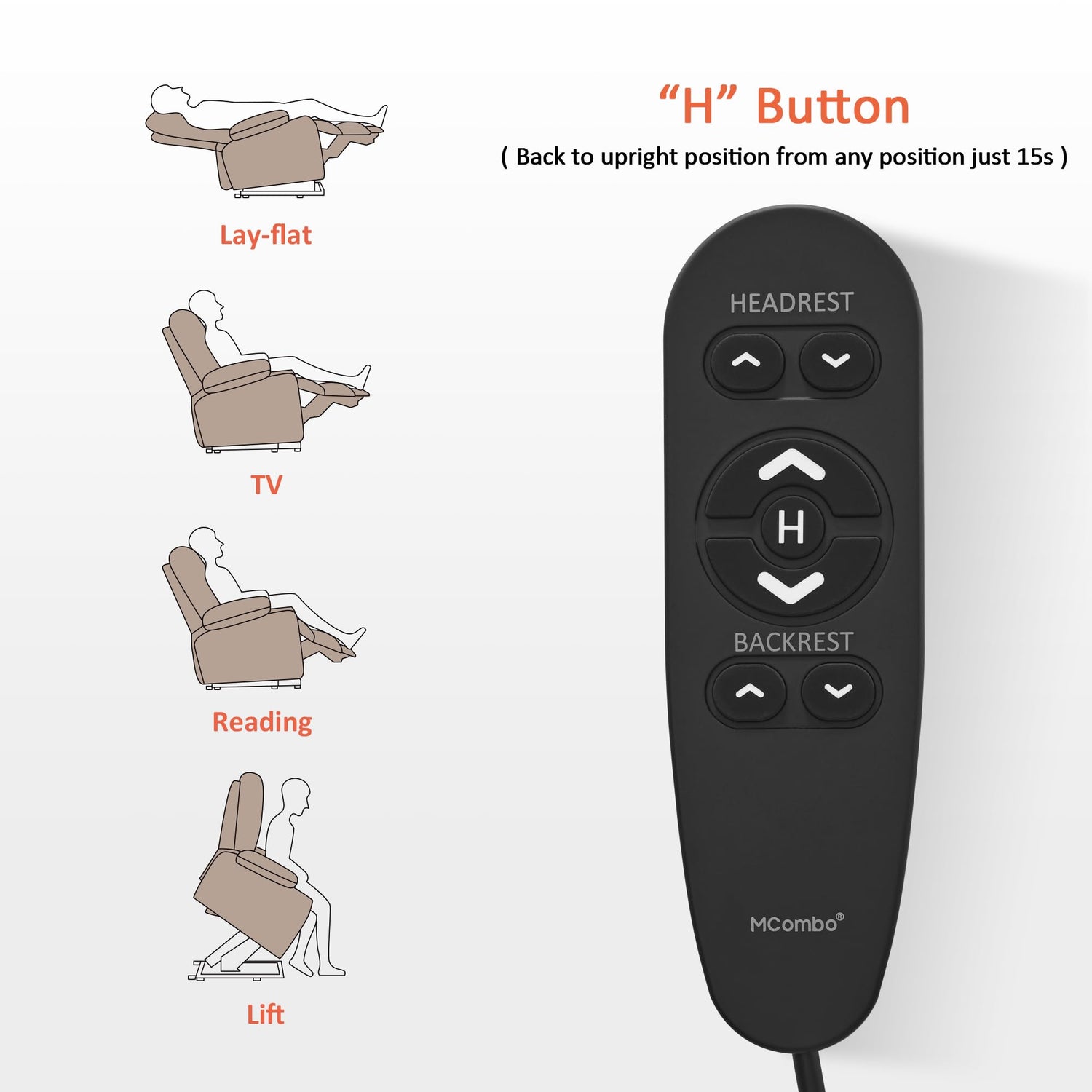 - Home Button: When someone knocks on the door, simply press the HOME button, the backrest, base and headrest will simultaneously return to an upright position in up to 16 seconds, with the backrest moving first for safety