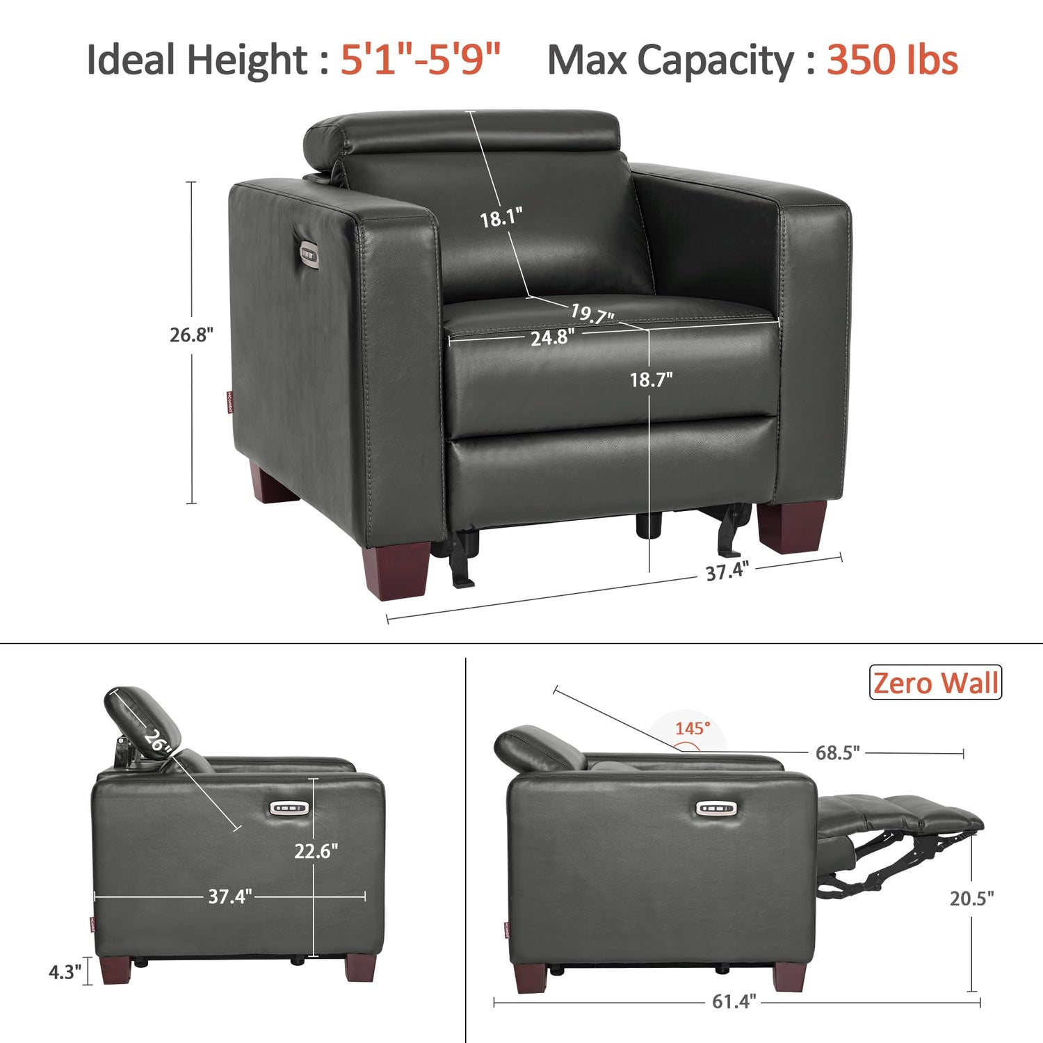 MCombo Zero Wall Recliner Chair, Wall Hugger Power Recliner Chair with Adjustable Headrest, High Wood Leg, USB Charge Ports, for Living Room, Small Spaces, HL128 (Faux Leather, Dark Grey)
