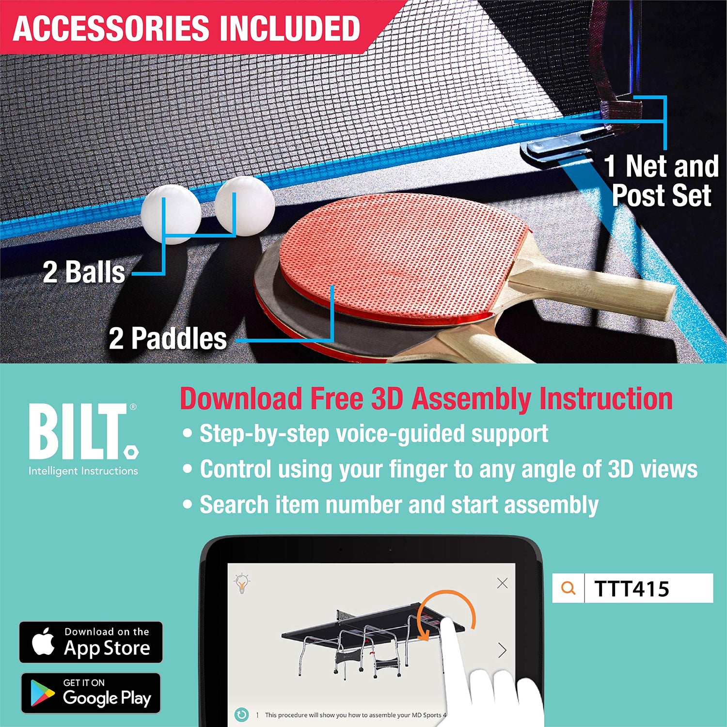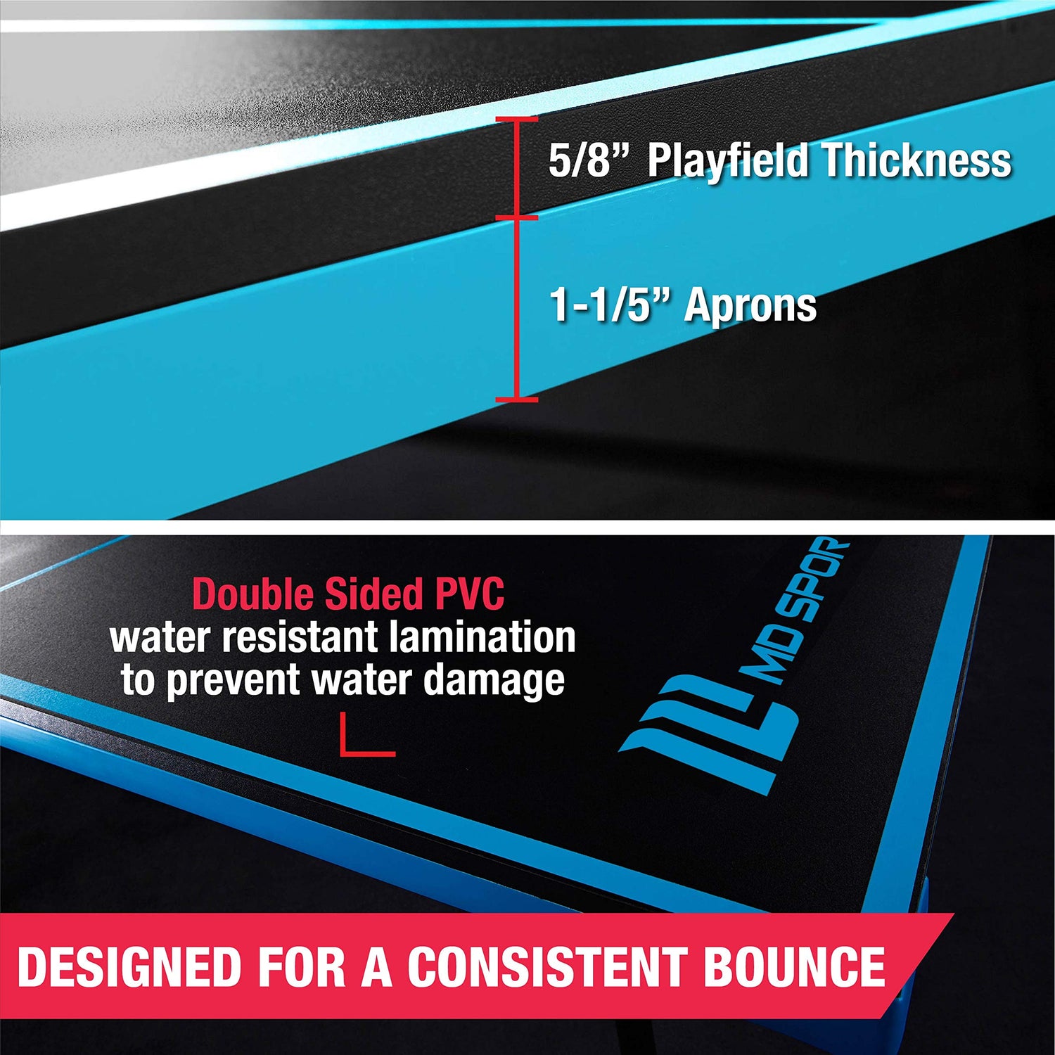 MD Sports Table Tennis Table boasts a responsive 5/8"" surface so you can make impressive side spins, smashes and forehand drives. Our tournament size 9' x 5' table has a full apron all around for added resilience. Posts clamp into position in seconds to attach the net securely to the table. Our paddles are made of 5-ply laminate and have the iconic pips-out rubber facings on both sides. Fold up 1 side of the table for practice or single play; or fold up both sides for maximum space saving in your guest room or man cave.
