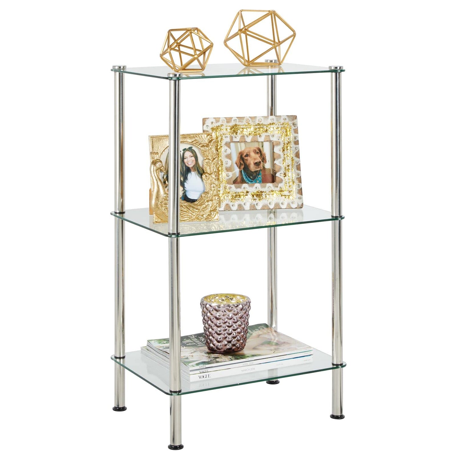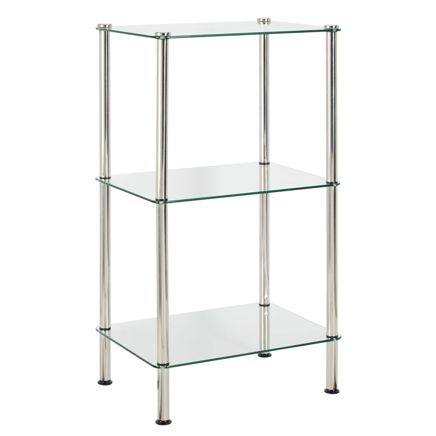 - STANDING STORAGE: Keep bathrooms, home offices, bedrooms, and living rooms neat and tidy with this storage shelf; This durable organizer has three easy-reach open front glass shelves stacked in a compact vertical format; The slim modern design is perfect for small spaces; Ideal for storing bathroom essentials like washcloths, rolled hand towels, and extra rolls of toilet paper; Perfect for displaying family photos, collectibles, books in living rooms and dens