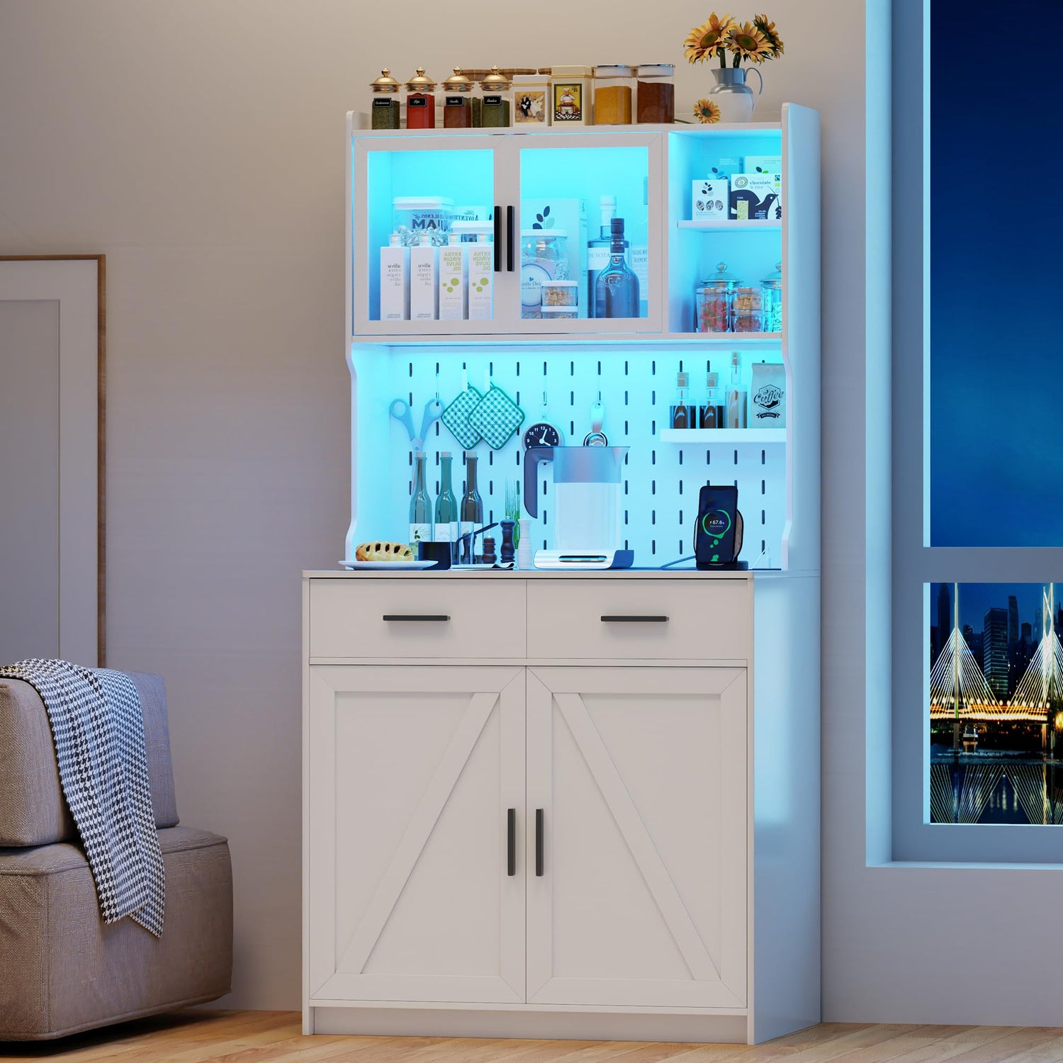 Upgrade your kitchen with the MDGC White LED Kitchen Pantry Cabinet, expertly designed to elevate your cooking experience. This multifunctional cabinet seamlessly combines stylish design with practical features, making it the perfect addition to any home.