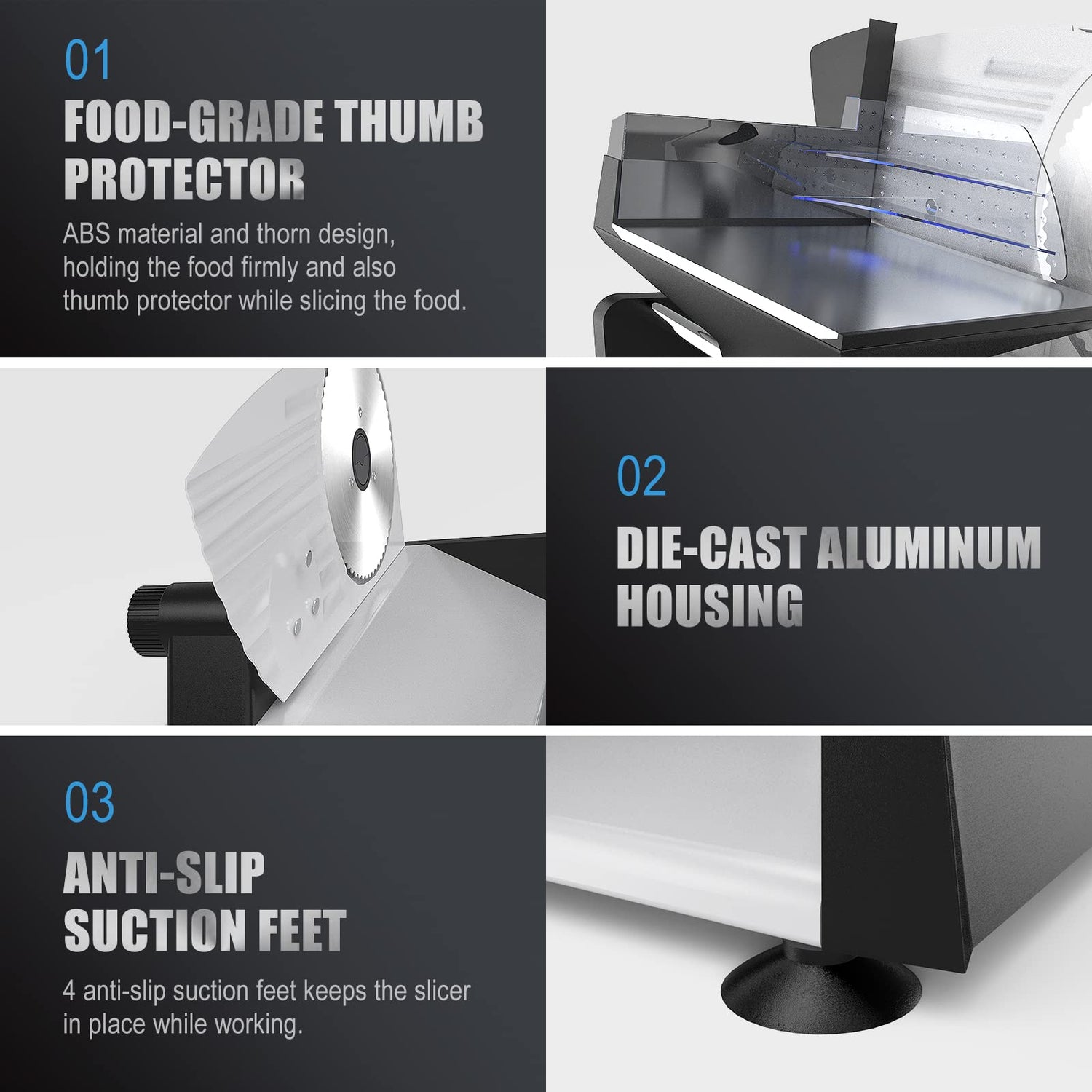 - 【PREMIUM & FRIENDLY FOOD SLICER】 Meat slicer for home use made of die-cast aluminum and anti-rust. With food-grade thumb protector and anti-slip suction feet, our meat cutter fully considers kitchen using case. Aims to provide more comfortable slicing experience. A good gift for parents and home cooking lover.