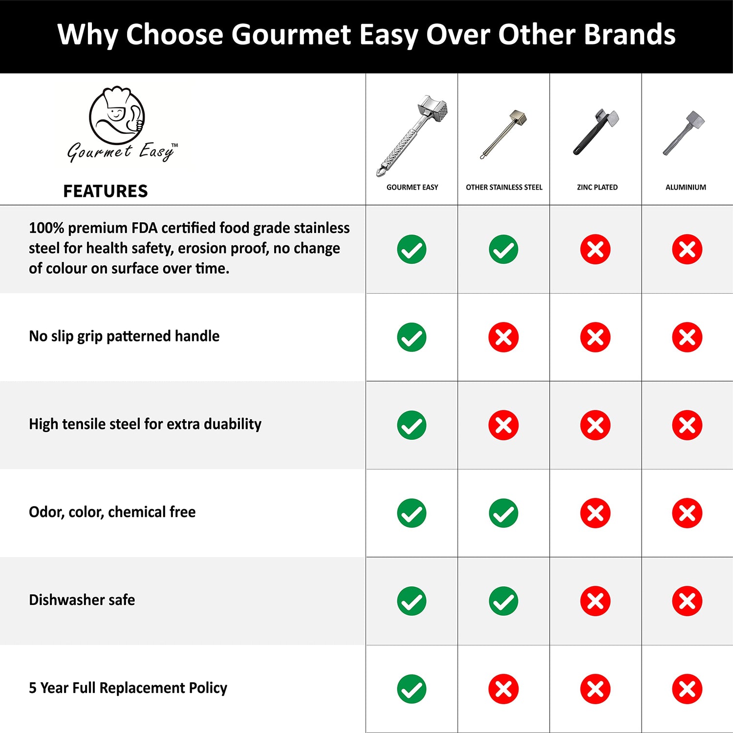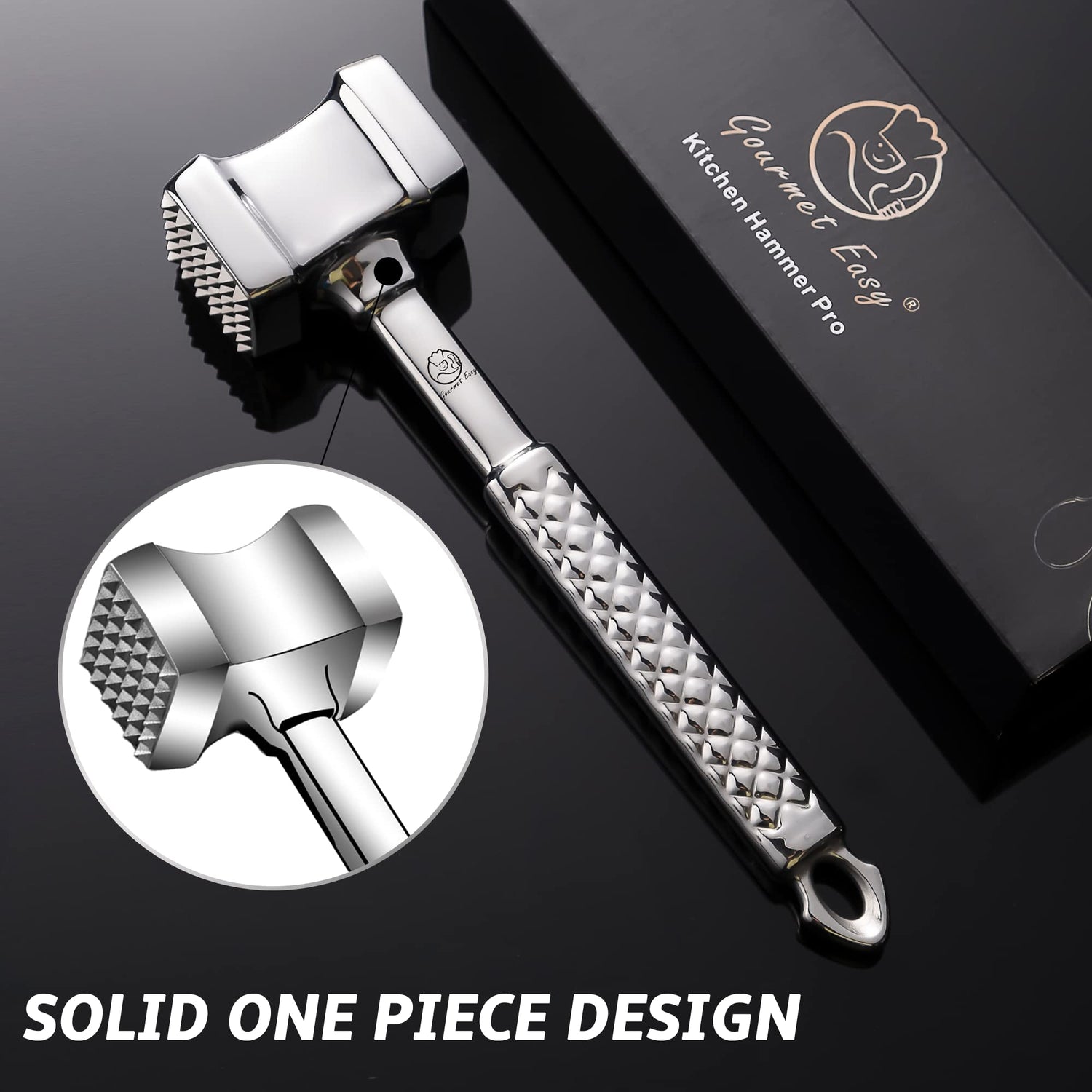 - BUILT TO LAST: 100% Stainless steel meat hammer tenderizer tool (304) crafted for exceptional durability & performance! We at Gourmet Easy use the highest-grade materials and innovative design to ensure that it will last a lifetime! A versatile ground beef smasher & a must-have cooking tool! Unconditional 5 Years Warranty.