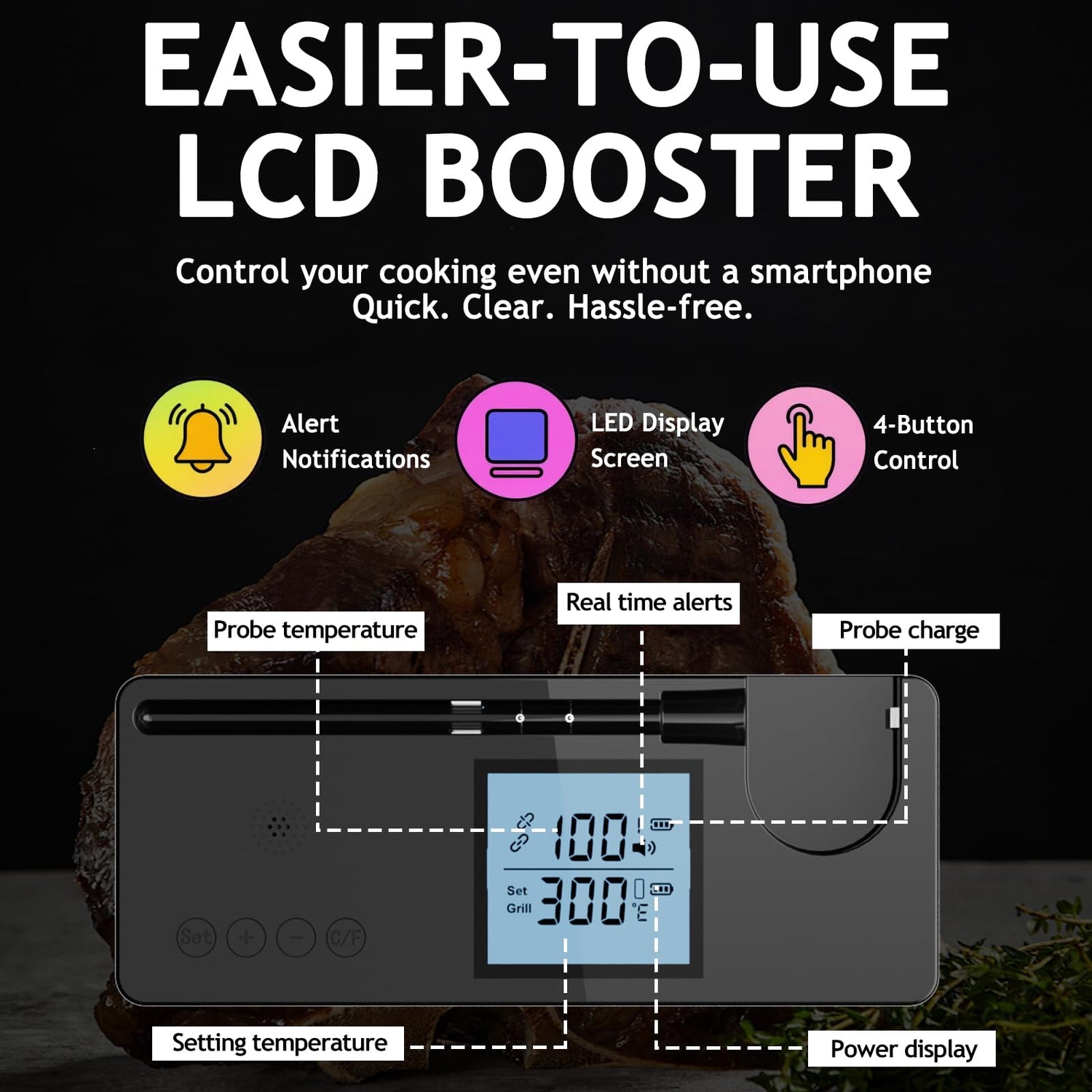 • 📺 Clear LCD Booster Display – Instant Read, No Phone Needed: Check temps directly on the booster’s LCD screen—perfect for quick monitoring. Unlike many digital meat thermometers, this bluetooth meat thermometer wireless delivers fast, accurate readings without needing your phone open.