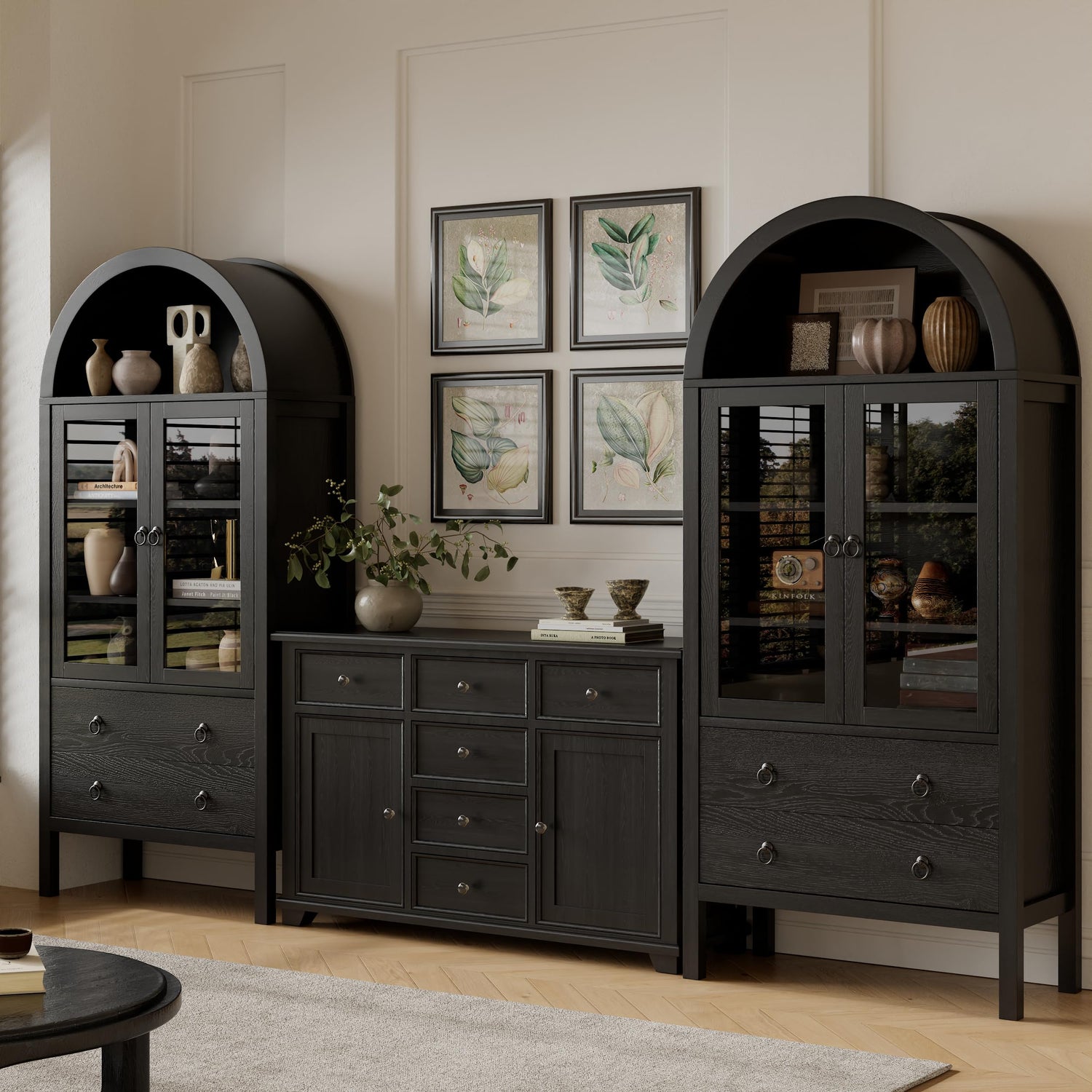 - VINTAGE-INSPIRED ARCHED BOOKCASE: A timeless fusion of distressed metal handles and graceful curves, this arched cabinet with glass doors adds character to modern farmhouse or urban chic interiors. The distinctive arched crown perfectly frames your cherished collections while tempered glass maintains pristine visibility and protection