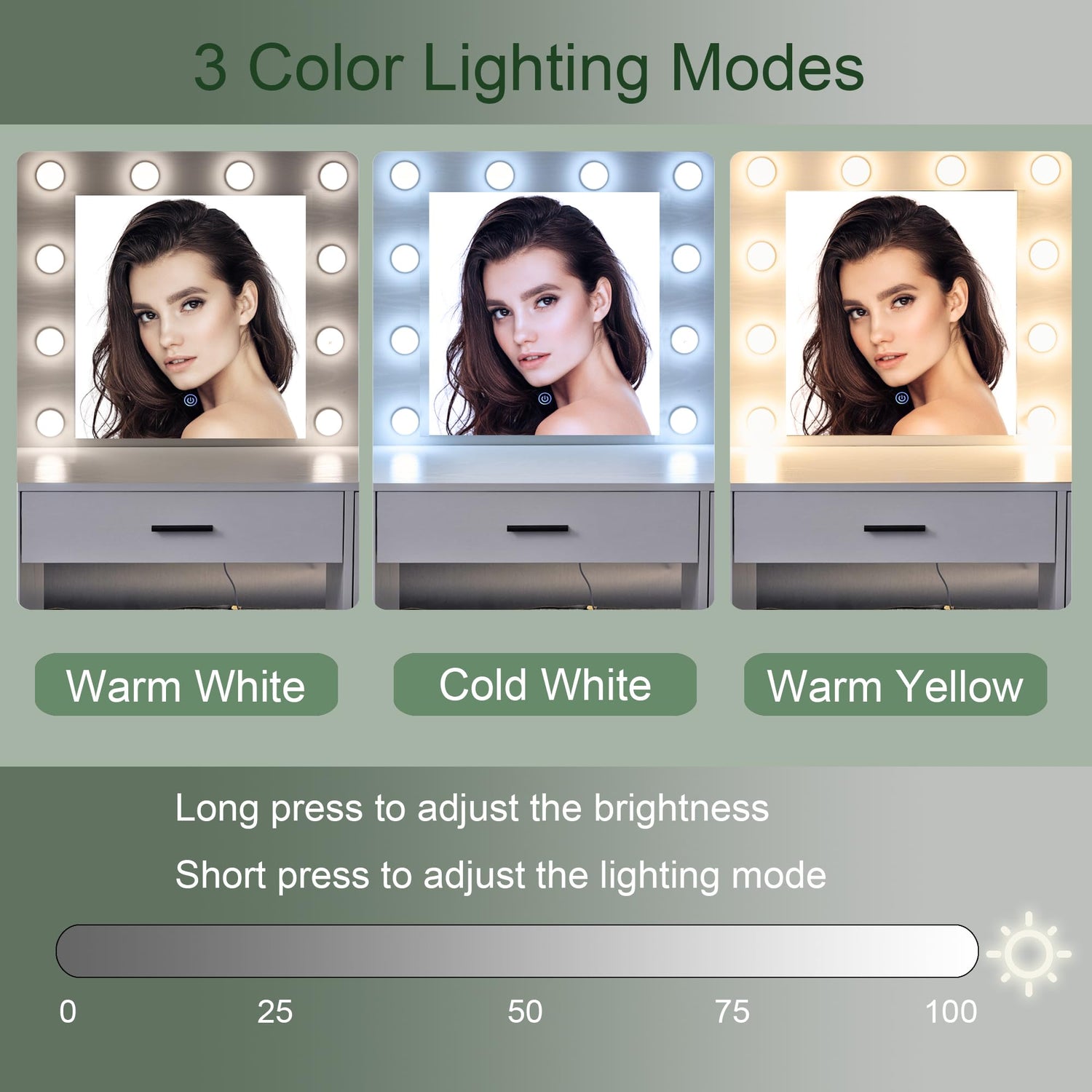 - SLIDING LED MIRROR: Adjustable LED mirror with cool, warm, and natural light settings. The vanity desk with mirror and lights features a sliding mirror that allows you to customize the position to suit your daily routine