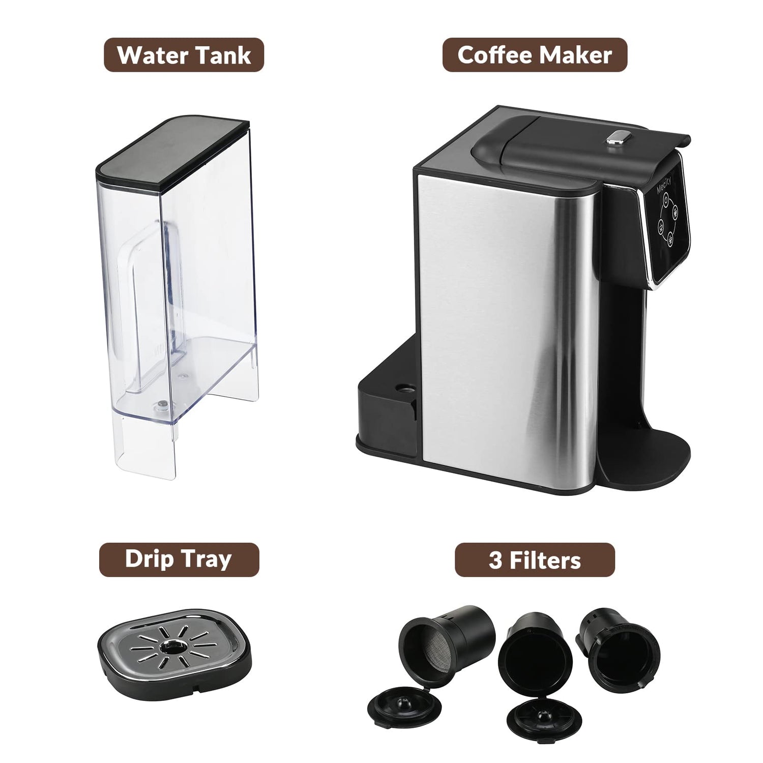 - Easy to Clean - BPA-FREE material for water tank and piercing needle. Detachable filter basket and drip tray can be removed and washed directly. A easy clean method by pressing button after adding in water and vinegar