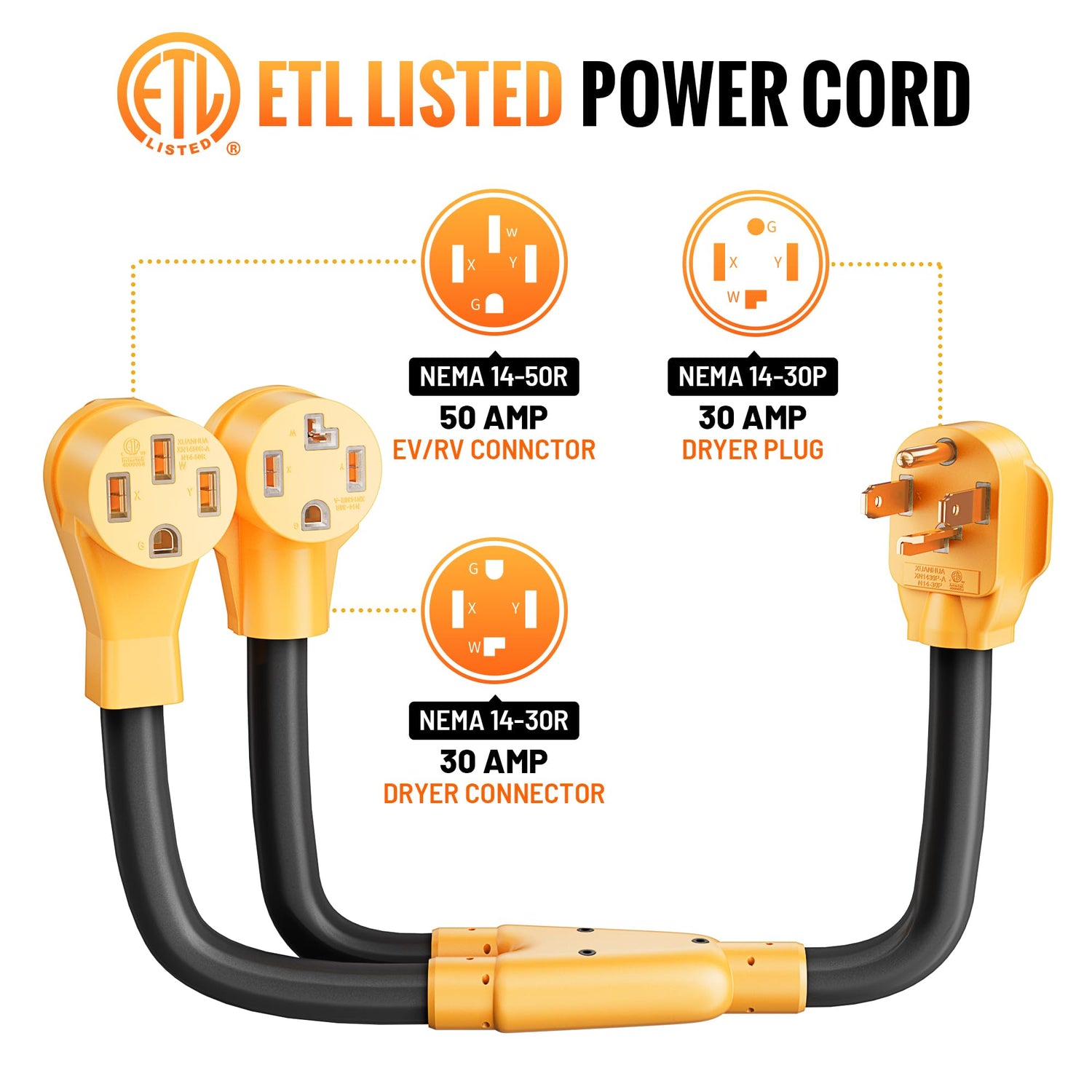 - Splitter Cord for EV RV Charging: - This splitter 14-30P to 14-50R and 14-30R adapter allows you to connect your RV/EV while remain a 14-30R dryer outlet, enables you to use 220V 30amp dryer outlet to charge EV or RV without unplugging dryer