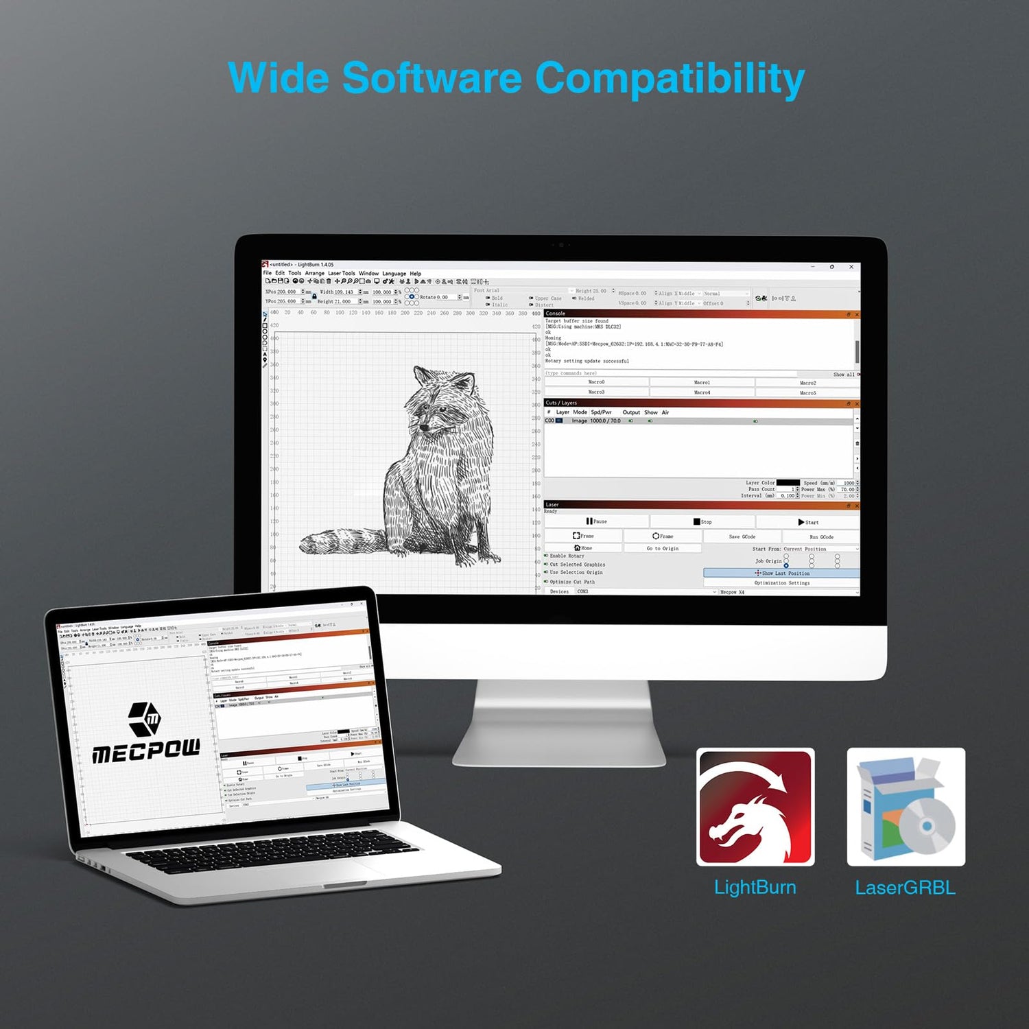 - Wide Compatibility: The rotary comes with 2 connection cables and is compatible with all Mecpow engraving machines and 95% of laser engraving machines on the market. It can also be connected to LightBurn and LaserGRBL. And it also comes with 4 heightening brackets (for MECPOW X3 and X5 series engravers) for larger engraving sizes.