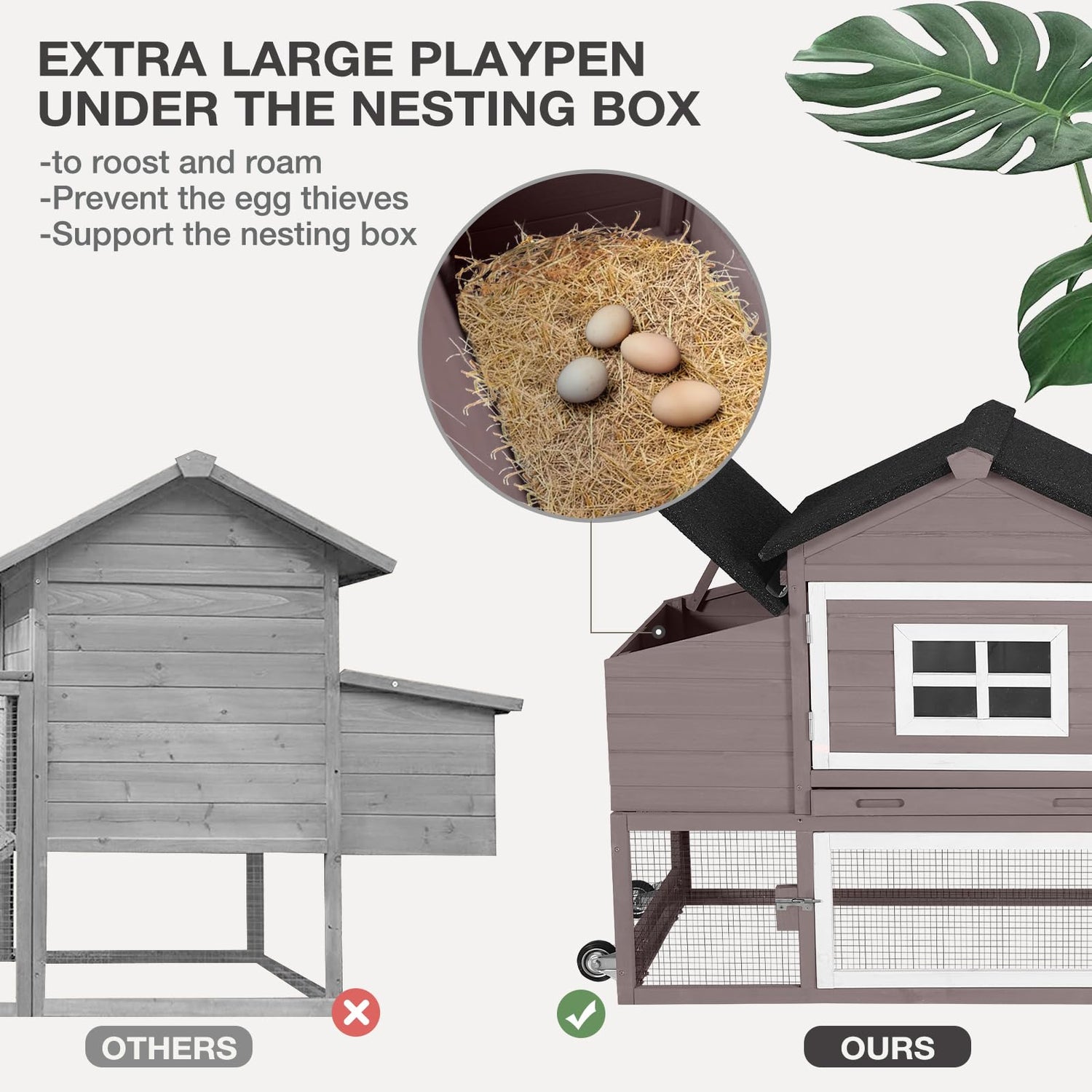 - 【Easy Cleaning & Large Run】: 4 access areas and a removable leakproof tray are easy to clean for pet poop and urine. An extra large playpen under the nesting box allows chickens to roost and roam and also prevents egg thieves