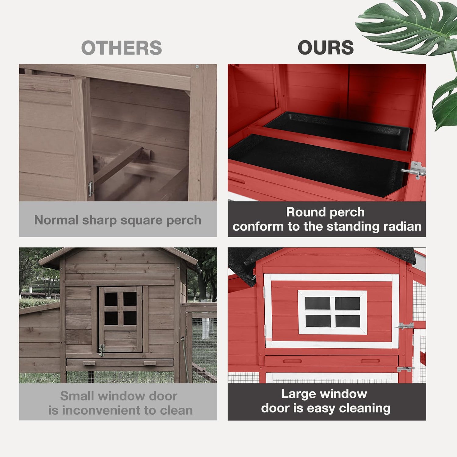 - 【Easy Cleaning & Large Run】: 4 access areas and a removable leakproof tray are easy to clean for pet poop and urine. An extra large playpen under the nesting box allows chickens to roost and roam and also prevents egg thieves