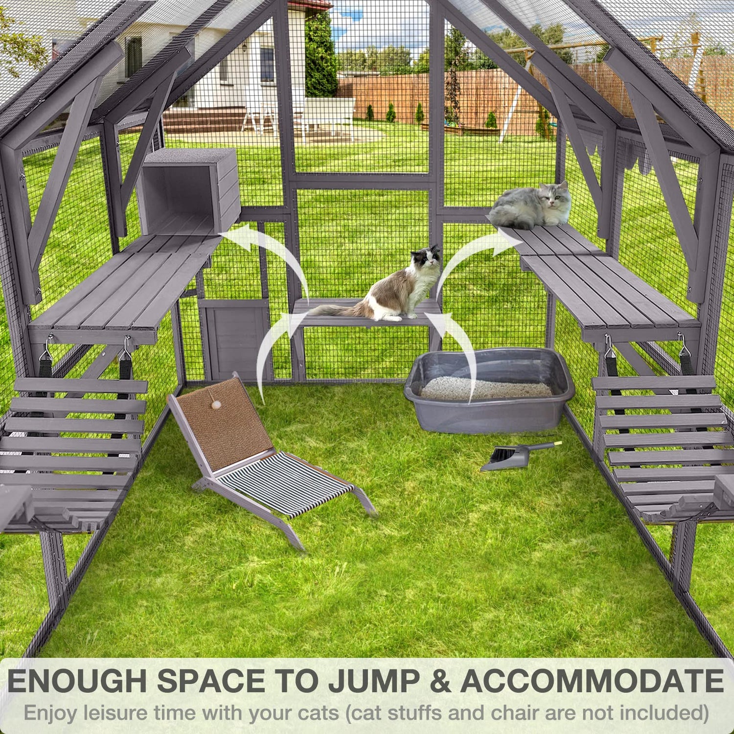 - Jumbo Catio: Jumbo 56.54ft² space to accommodate cat stuffs and your chairs. There's nothing better than having a cat on your lap, bonding time and a cat nap! Enjoy leisure time with your cats within the cat house can help strengthen your cat's bond with you.