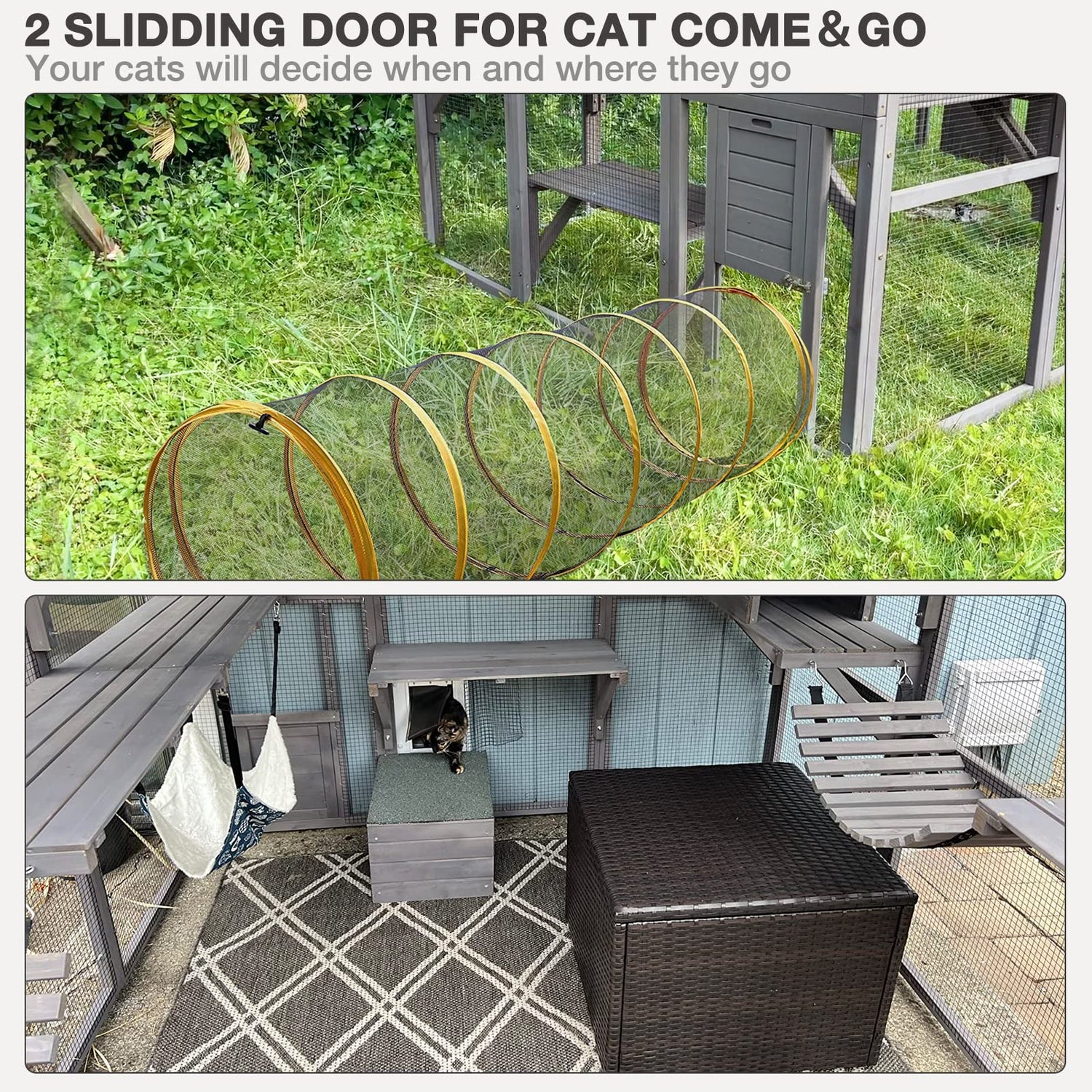 - Freedom to Come & Go: If 2 side small doors are attached to the cat tunnel or cat door, your cats will decide when and where they go.