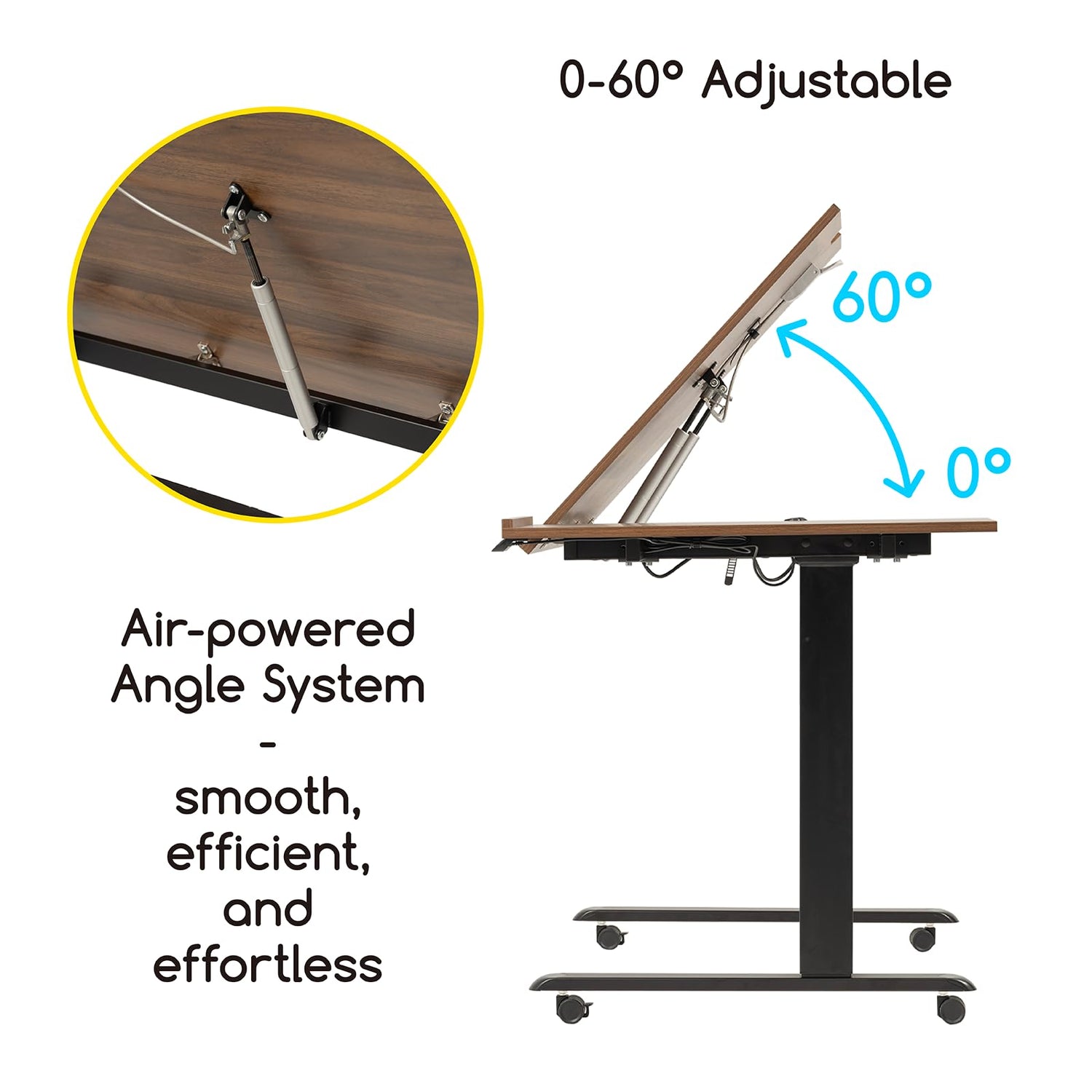 - Large Tilting Tabletop: Designed for creators who work a long time on the table, the electric drafting table is easy to adjust the height from 31.5" to 51.2" and angle from 0 to 60° to always remain in a proper position when writing, reading, and drawing. The 40 x 27" large tabletop provides a large enough workspace for extra-large design drafts. The tilted desktop is supported by air-powered angle system, withstanding a maximum weight of 176lb.