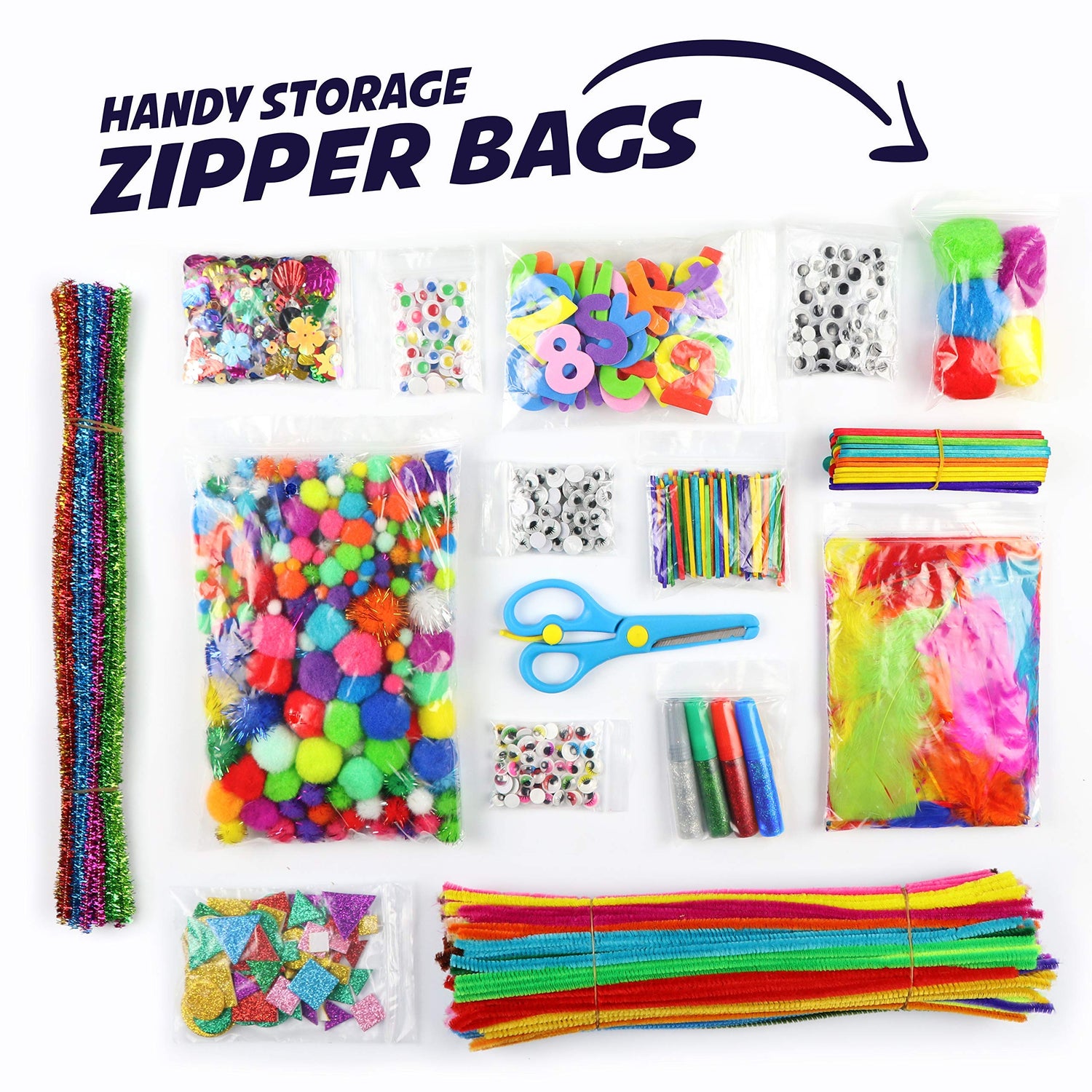 • ENORMOUS ASSORTMENT: Materials included are 150 pipe cleaners, 50 metallic pipe cleaners, 245 assorted size pom poms, 5 jumbo pompoms, 95 glitter pom poms, 4 glitter glue pens, 1 safety scissor, 200 adhesive googly eyes (in assorted colors and sizes), 30 wooden colorful craft popsicle sticks, 100 craft matchsticks, 30 foam letter & number stickers, 30 glitter foam sticker shapes, 50 colorful craft feathers and 1000 sequins/spangles. (Some items are packed by weight—quantities are approx.)