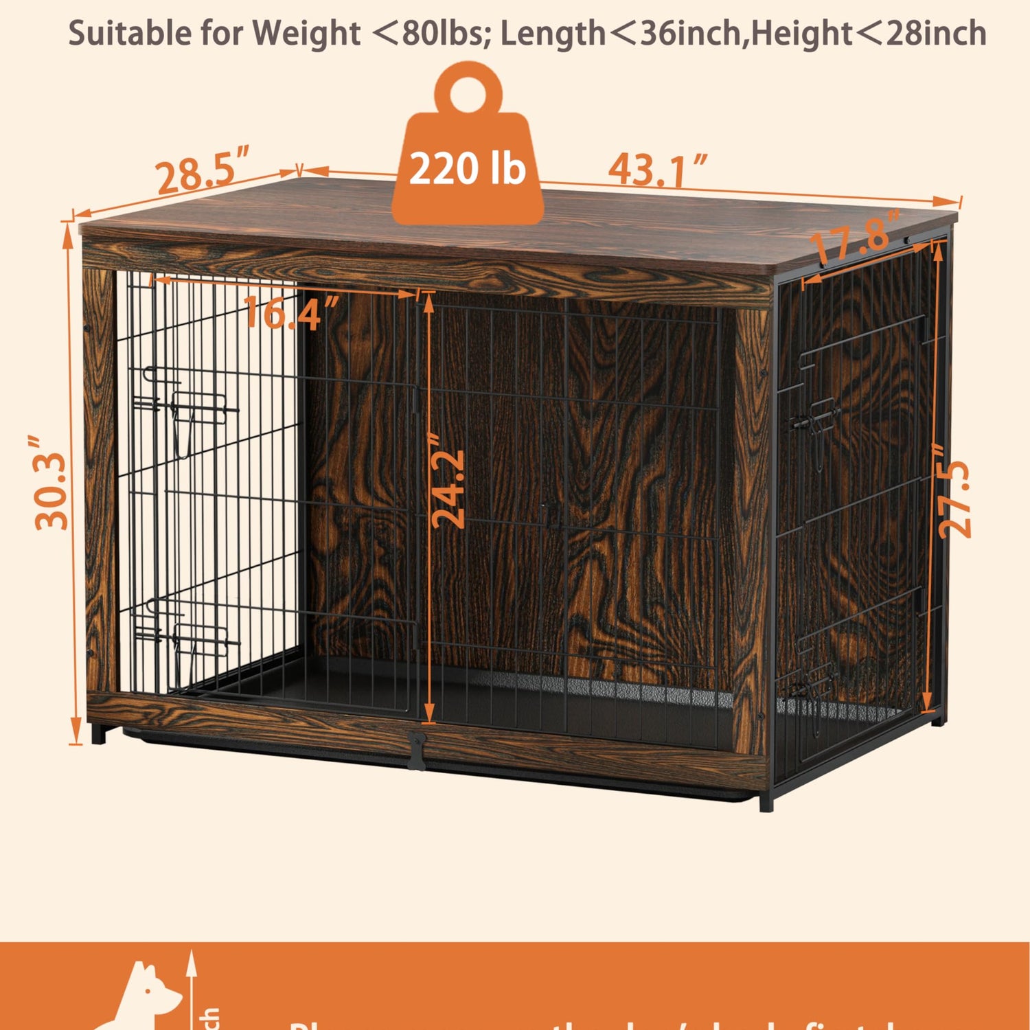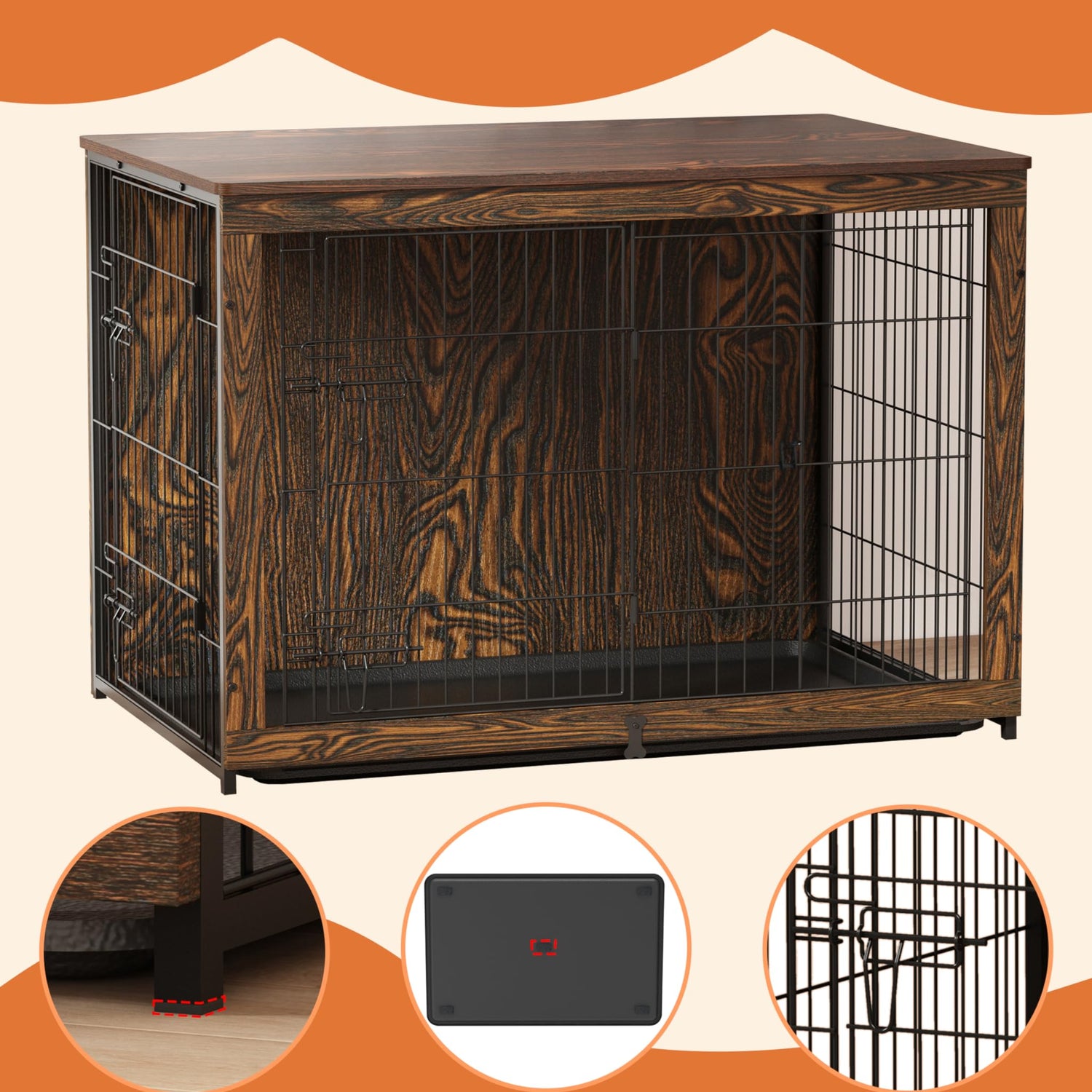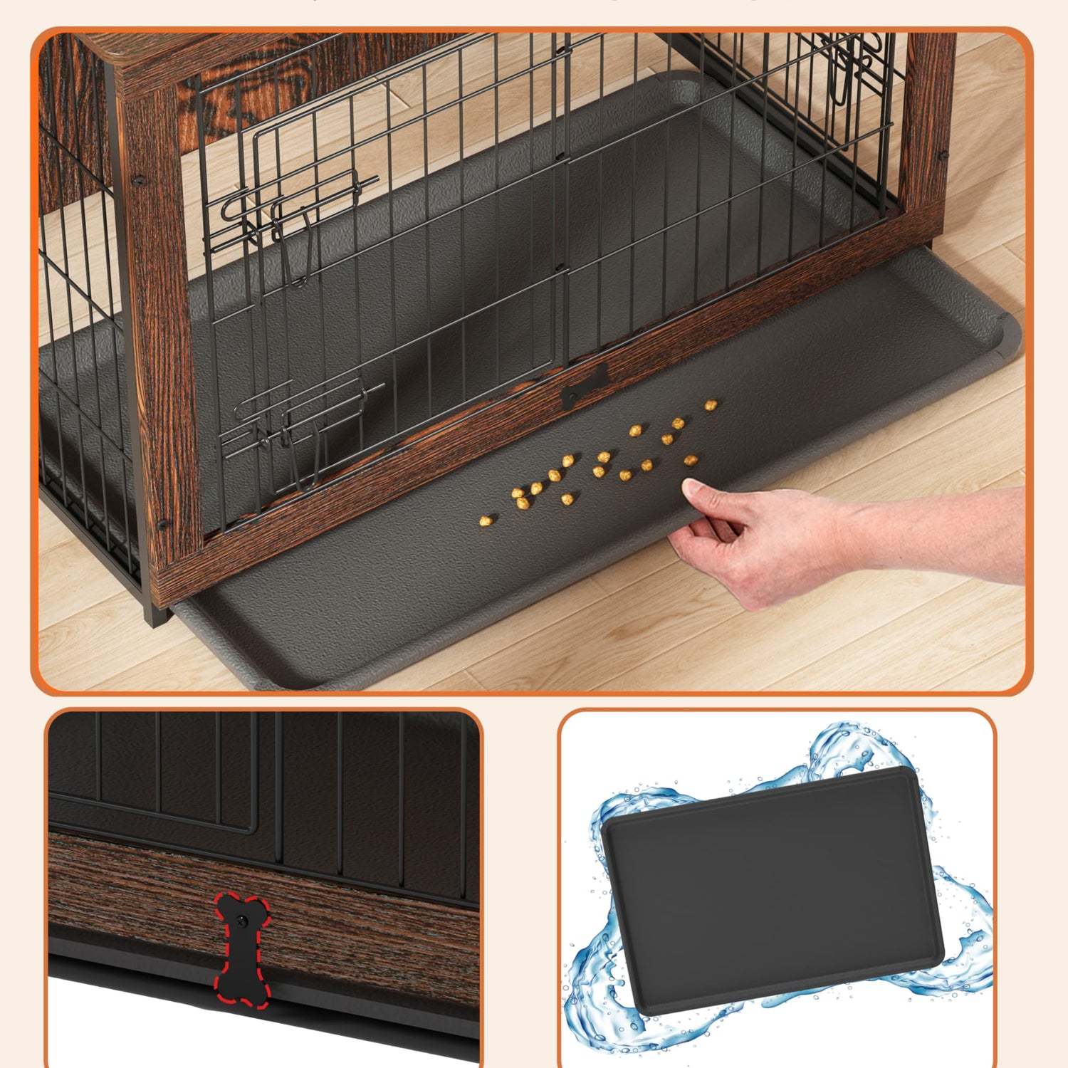 - 【Easy-to-clean Tray】The interior of the dog crate needs regular disinfection and cleaning of fur and dirt. The durable, odor-resistant tray can be easily pulled out and cleaned in case of accidents, something a wooden board can't do. The bone-shaped baffle secures the tray in the crate and prevents it from sliding out. (The tray comes with 5 felt pads underneath to protect your floor from scratches)