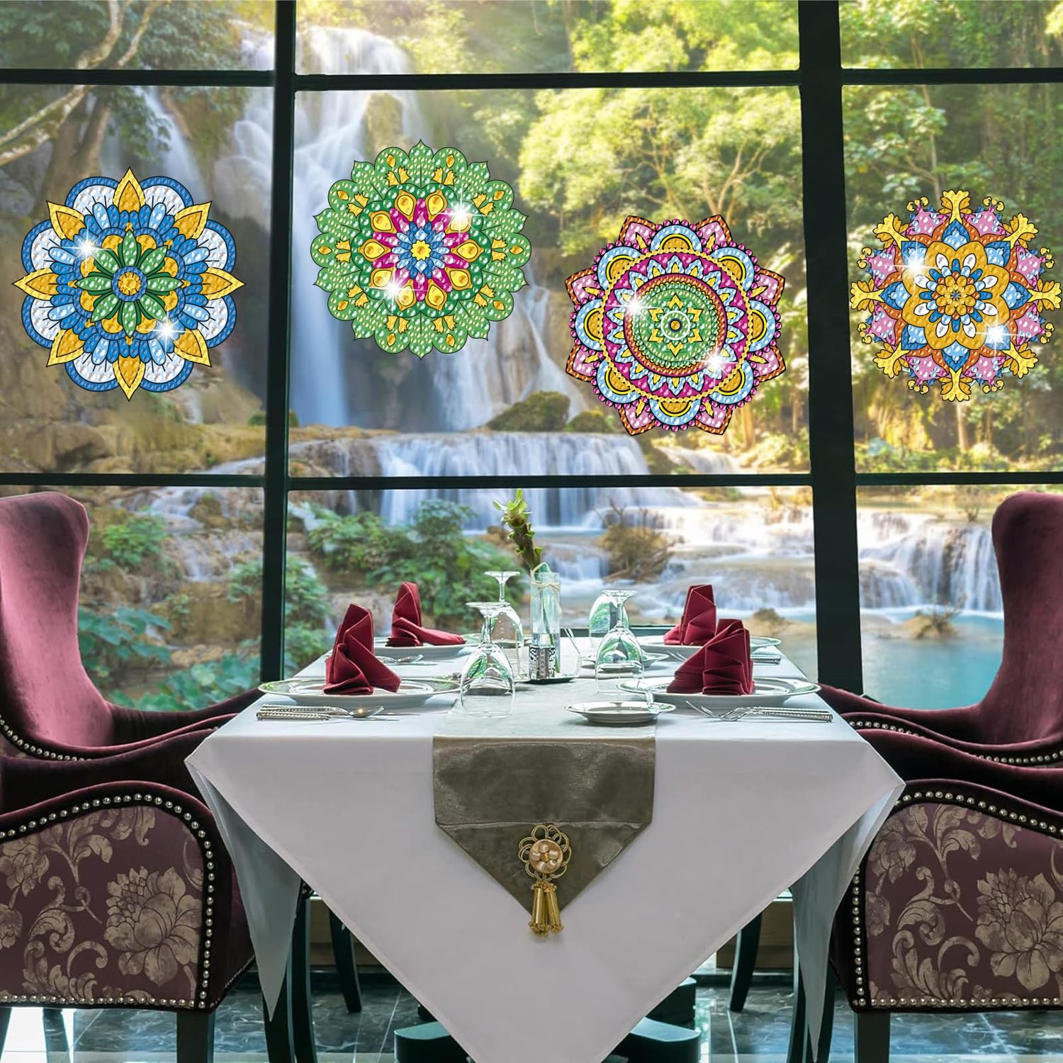 - Creative window decorations:Add a pop of color and warmth to your home with these 6 bright and eye-catching Mandala Window Stickers. Capture the colors of the sun and reflect them onto your floors, walls, and corners with this diamond Art painting sticker kits.When the diamond Art painting window clings are illuminated by the sun, there will be colorful light mapped to your room, making it beautiful and dazzling.