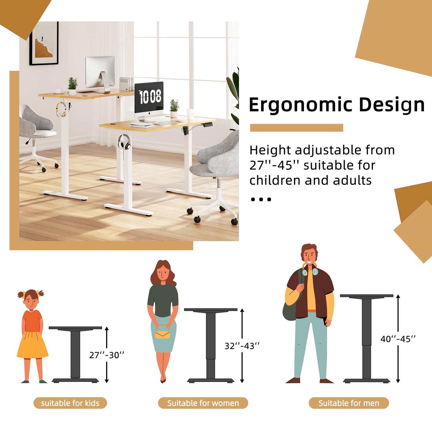 - Memory Height: The electric lift system can save you from the manual height adjustment. Meantimes, the height adjustable desk has 3 memory preset buttons to customize your desired heights from 27.56 inch to 45.28 inch