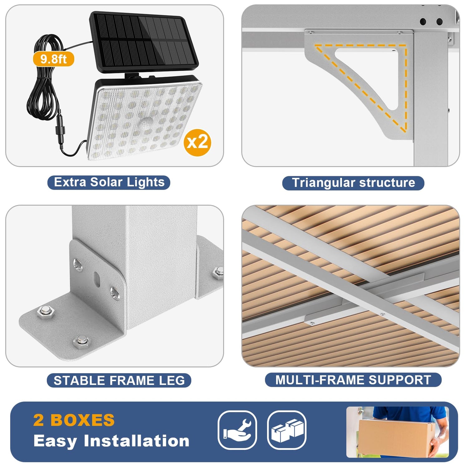 - 【EXTRA SOLAR LIGHTS & STURDY FRAME】The wall-mounted gazebo features durable powder-coated aluminum for strong support and resistance to fading, rust, and corrosion. Pergola with pre-drilled feet and ground stakes for added stability, awnings for patio ensures secure and reliable use. The included solar light enhances ambiance and illumination for enjoyable outdoor evenings.