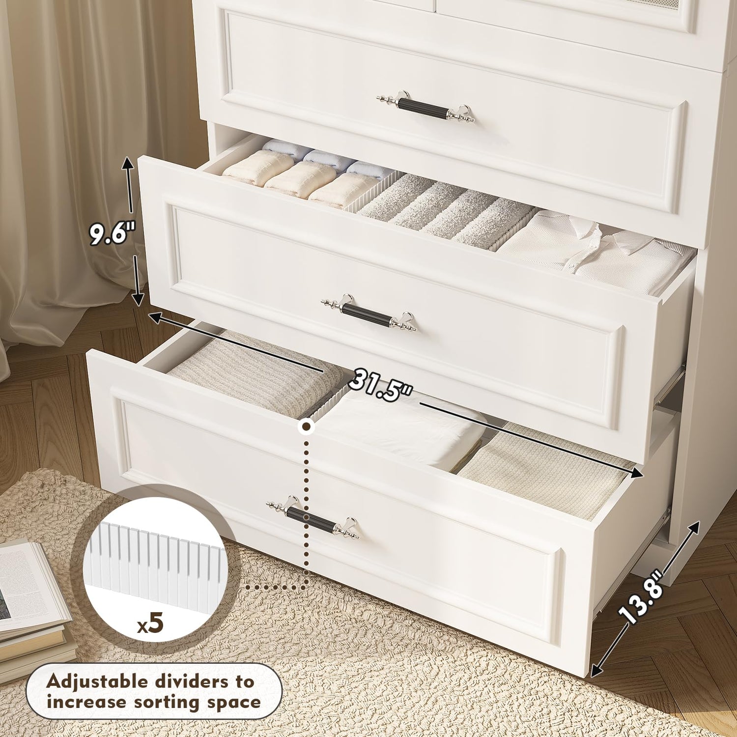- 【LARGE CAPACITY WARDROBE】 The bedroom wardrobe armoire offers flexible combinations. The metal rod provides hanging space for longer items like coats and suits. Shelves are ideal for folded clothes and linens, while drawers store socks, underwear, and small items. The side features 4 metal hooks for scarves and bags