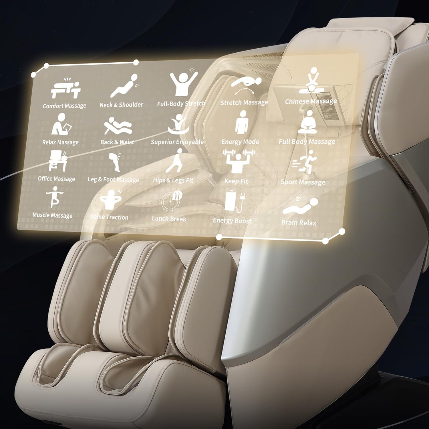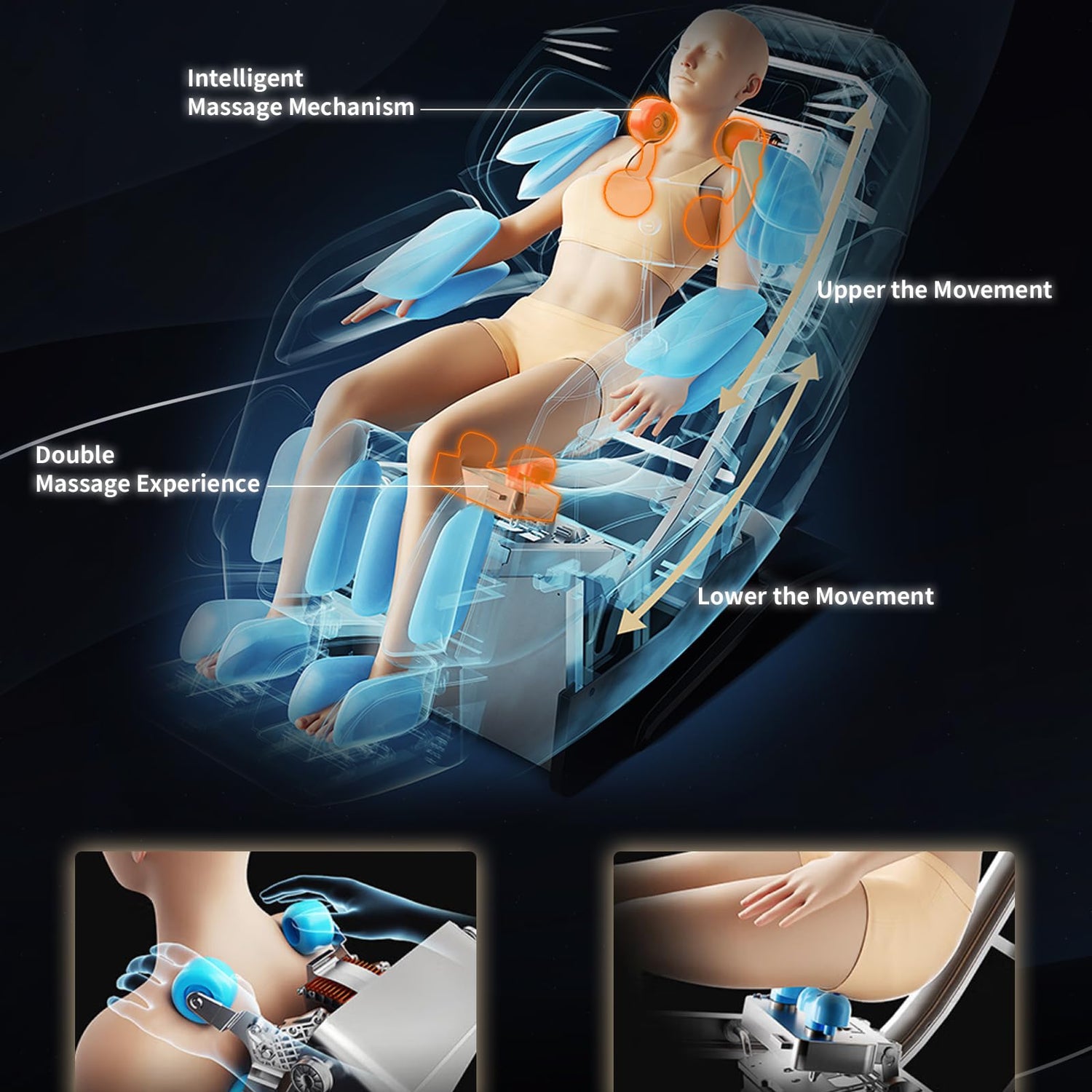 - 150° Zero Gravity Reclining Design: Designed to align perfectly with your spine’s natural curvature, this massage chair reclines to a 150° zero-gravity position, offering optimal support and relaxation. Enhanced with a dual-end track massage system, it provides broader coverage and deeper relief, allowing you to fully unwind in the most comfortable position tailored to your body.