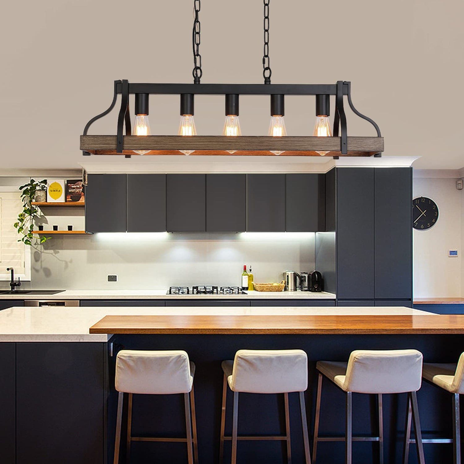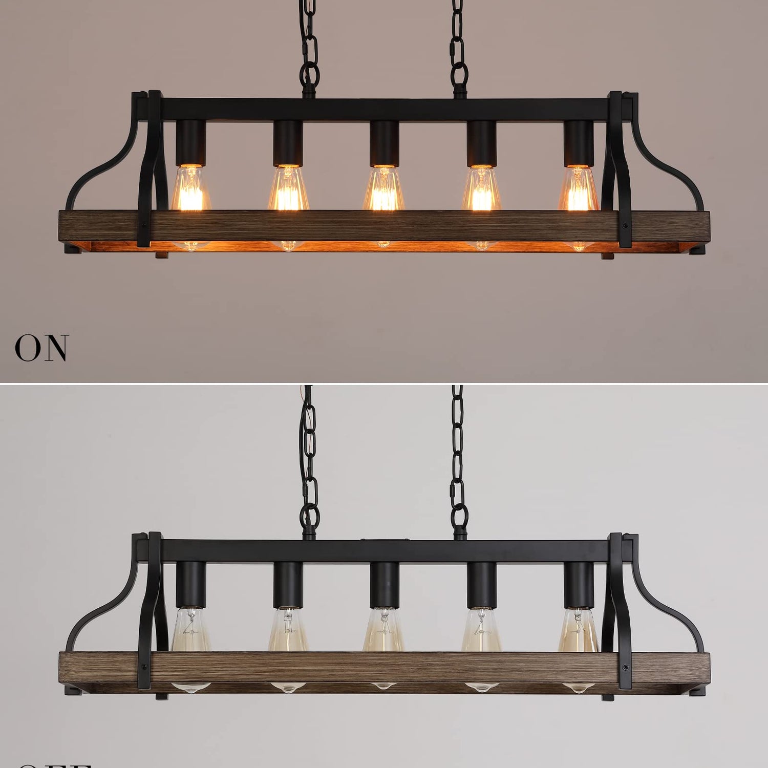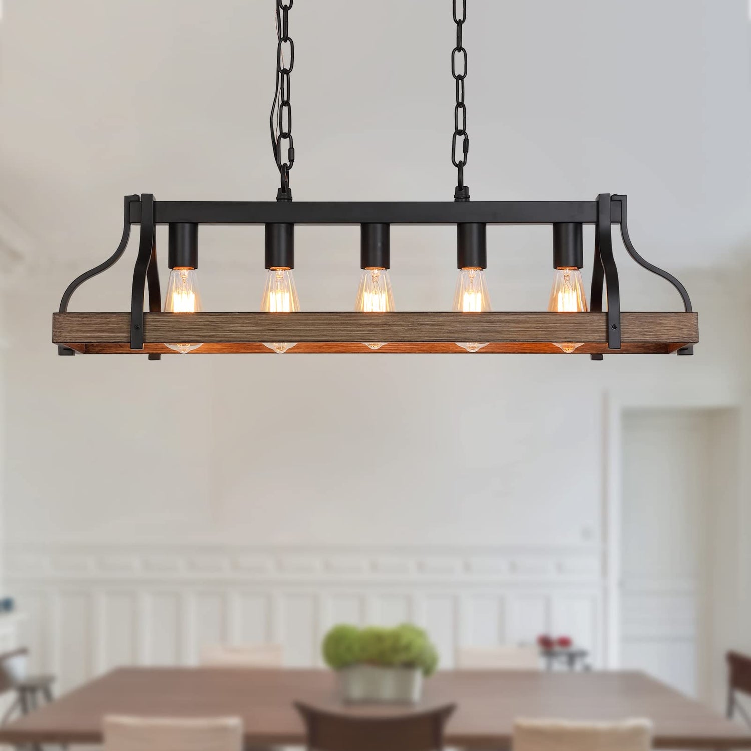 - Design:The 5-light hanging kitchen island chandelier's rectangular frame is designed with imitation wood, which brings a farmhouse country feel to the whole lamp body. It is simple and timeless, and it is a different experience to install in any space of your home.
