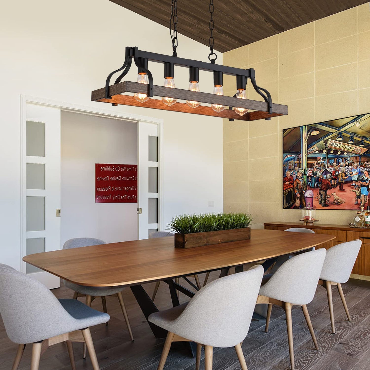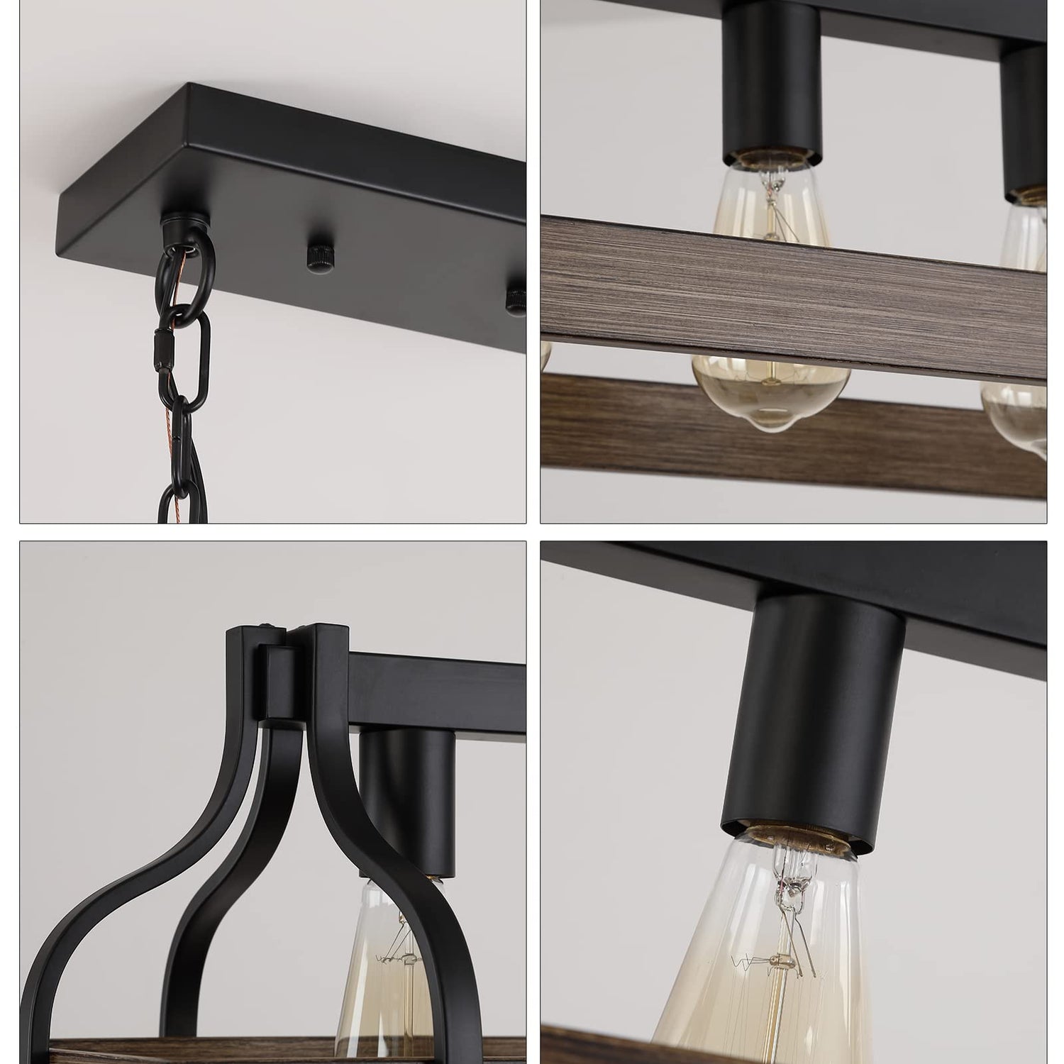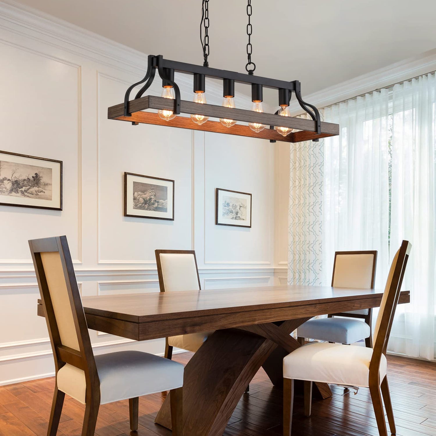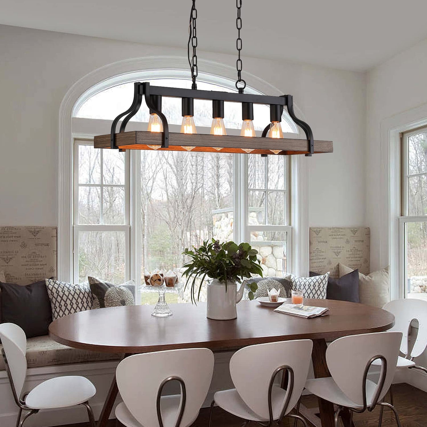 - Design:The 5-light hanging kitchen island chandelier's rectangular frame is designed with imitation wood, which brings a farmhouse country feel to the whole lamp body. It is simple and timeless, and it is a different experience to install in any space of your home.