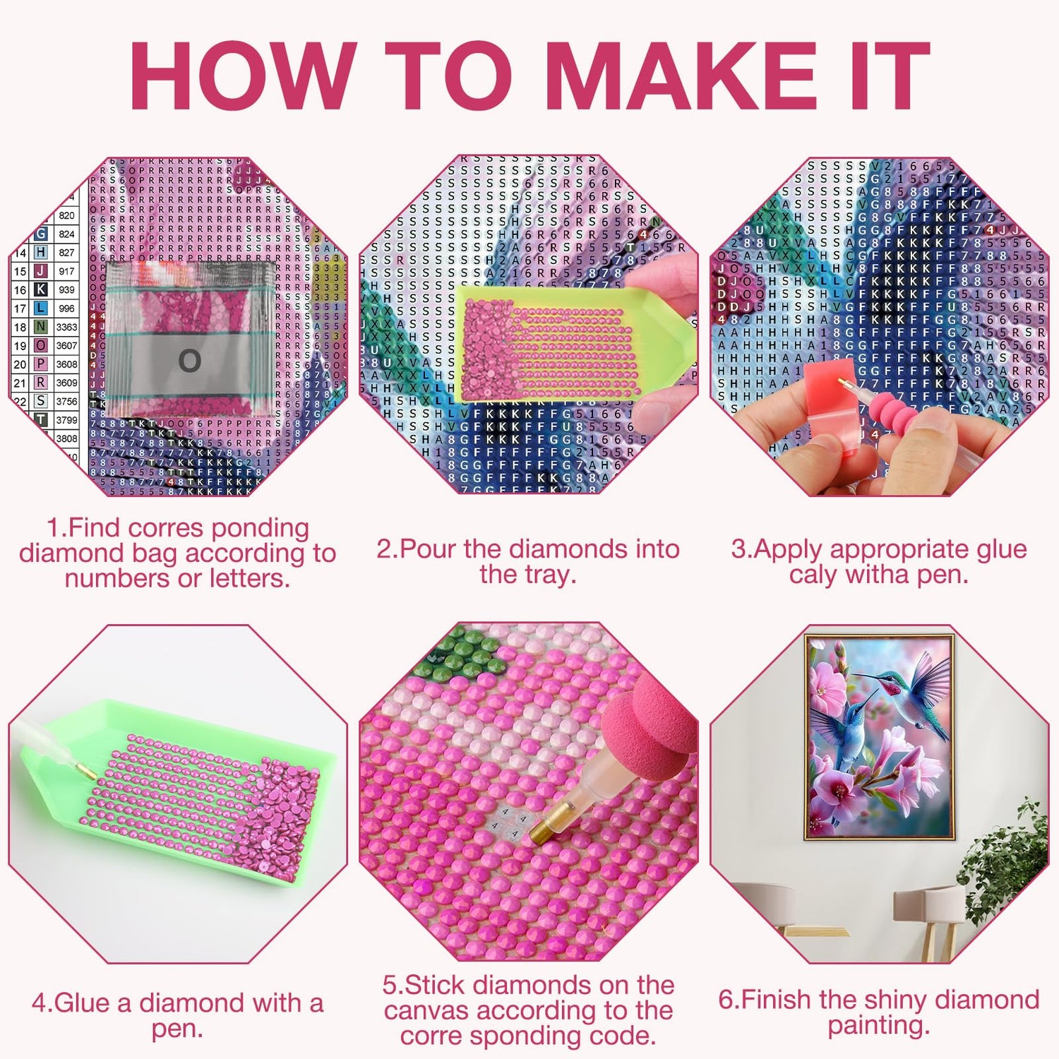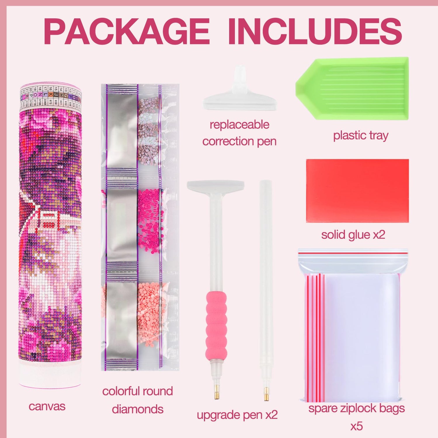 - DIAMOND PAINTING KIT INCLUDES: The Diamond Painting Kit comes with all the tools needed, you will receive the following tools 1x canvas, 2x diamond pens, 1x diamond tray, 1x glue clay, 1x replaceablecorrection pen, 5x ziplock bags for diamonds and enough colorful diamonds to start your wonderful DIY experience.