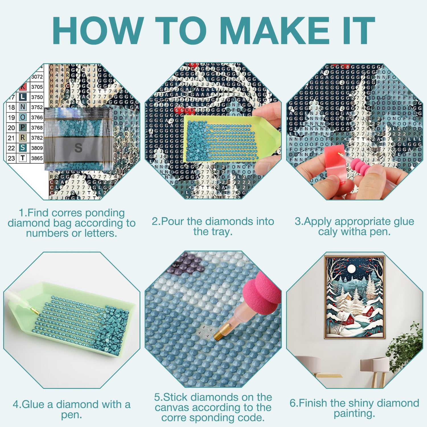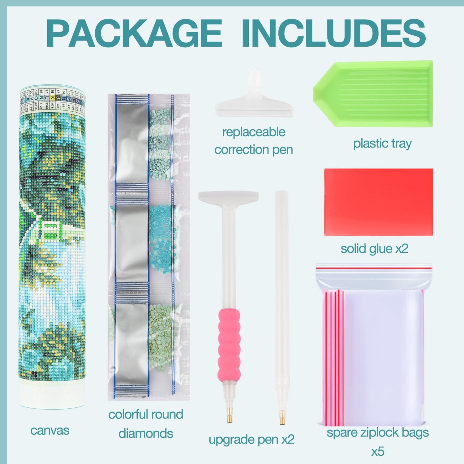 - DIAMOND PAINTING KIT INCLUDES: Each Diamond Painting comes with all the tools needed, you will receive the following tools 1x canvas, 2x diamond pens, 1x diamond tray, 1x glue clay, 1x replaceablecorrection pen, 5x ziplock bags for diamonds and enough colorful diamonds to start your wonderful DIY experience