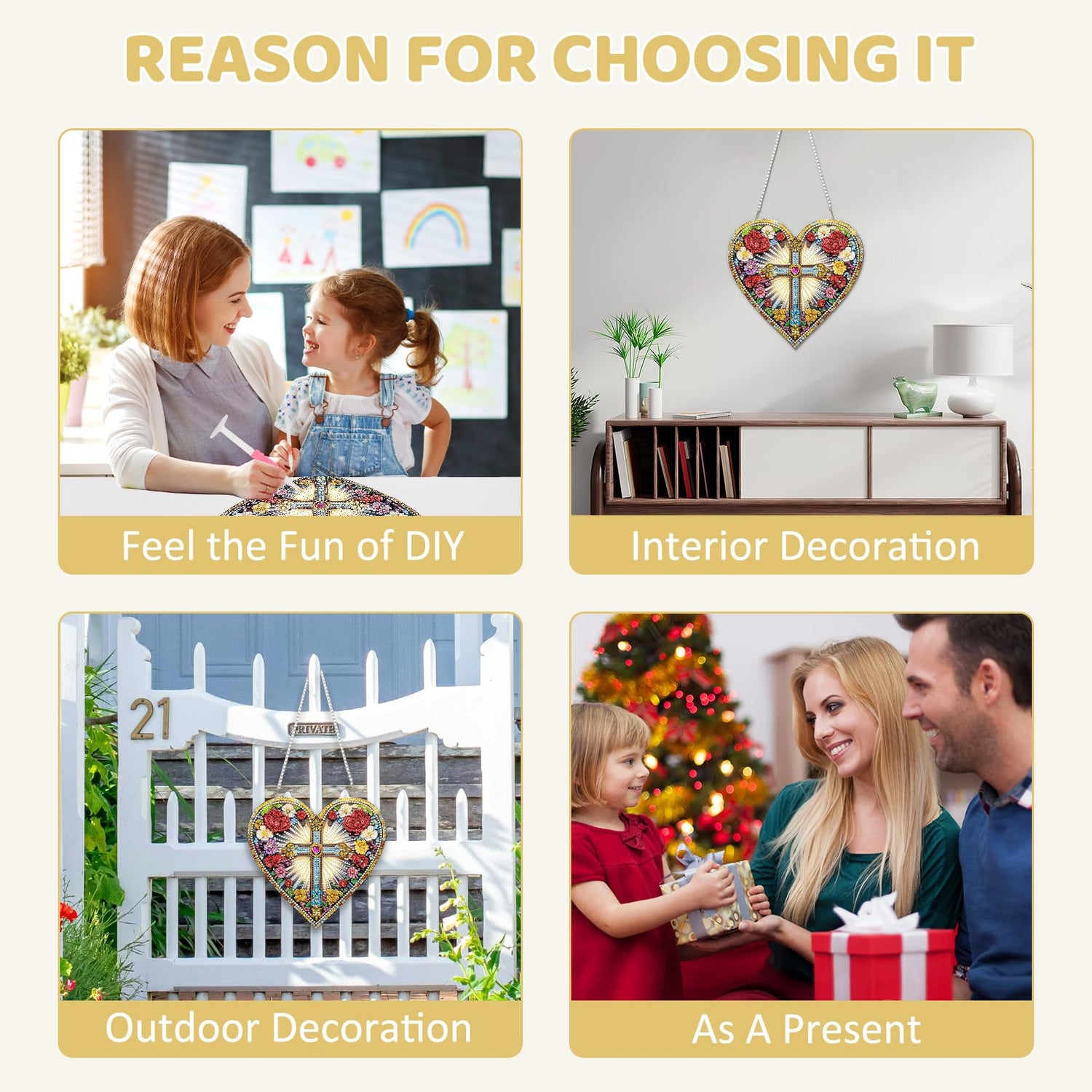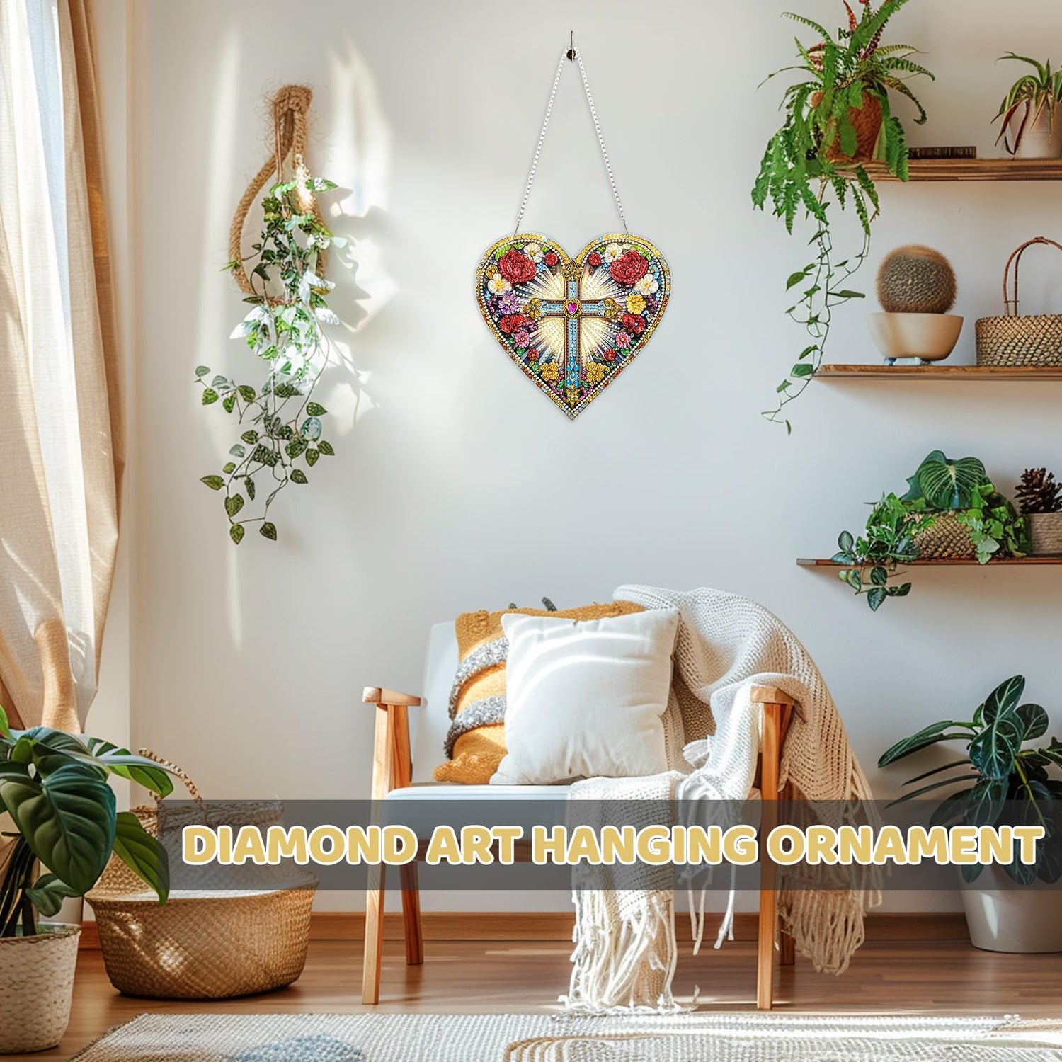 MEIYUDA Cross Diamond Painting Pendant Kits, DIY Heart Cross Special Shaped Diamond Art Hanging Kits for Adults, 5D Crystal Diamonds Painting Acrylic Pendant Ornamen for Home Decoration