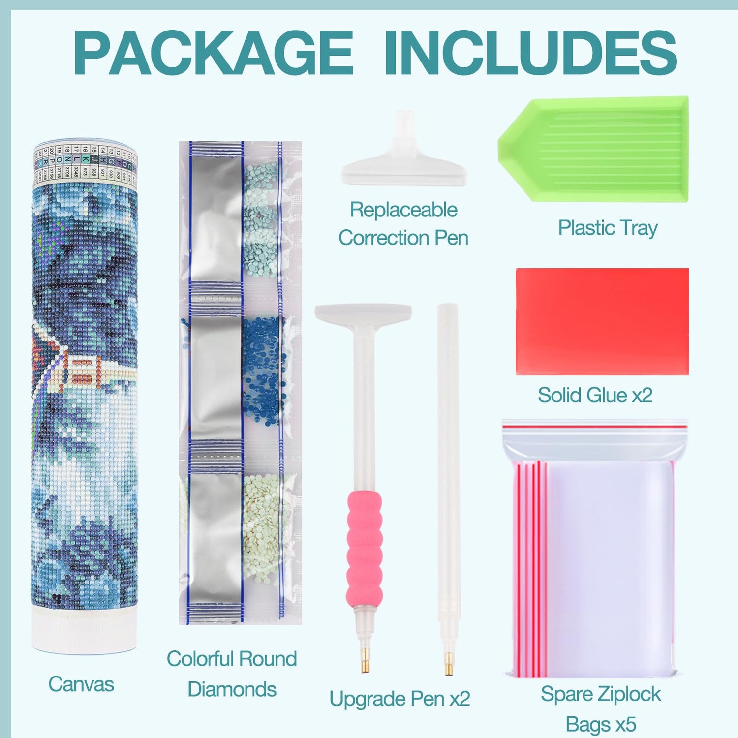 - DIAMOND PAINTING KIT INCLUDES: Each Diamond Painting comes with all the tools needed, you will receive the following tools 1x canvas, 2x diamond pens, 1x diamond tray, 1x glue clay, 1x replaceablecorrection pen, 5x ziplock bags for diamonds and enough colorful diamonds to start your wonderful DIY experience
