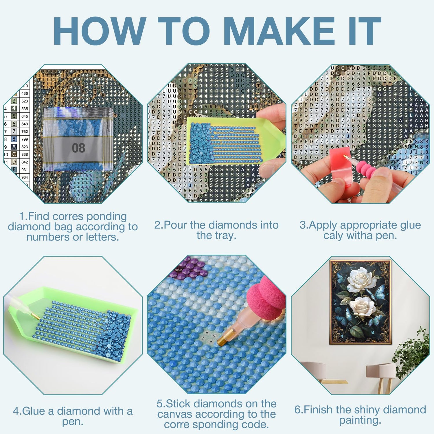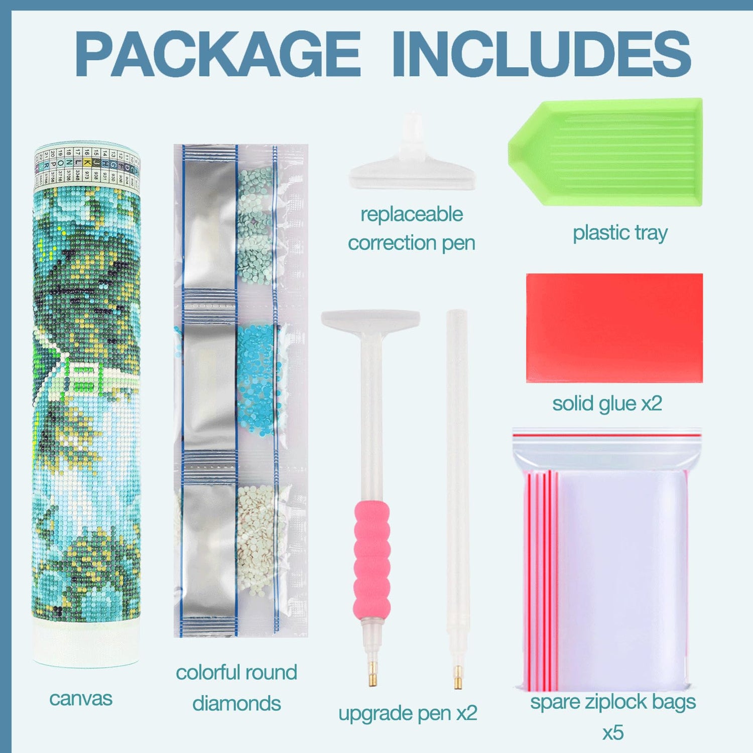 - DIAMOND PAINTING KIT INCLUDES: Each Diamond Painting comes with all the tools needed, you will receive the following tools 1x canvas, 2x diamond pens, 1x diamond tray, 1x glue clay, 1x replaceablecorrection pen, 5x ziplock bags for diamonds and enough colorful special shaped diamonds to start your wonderful DIY experience.