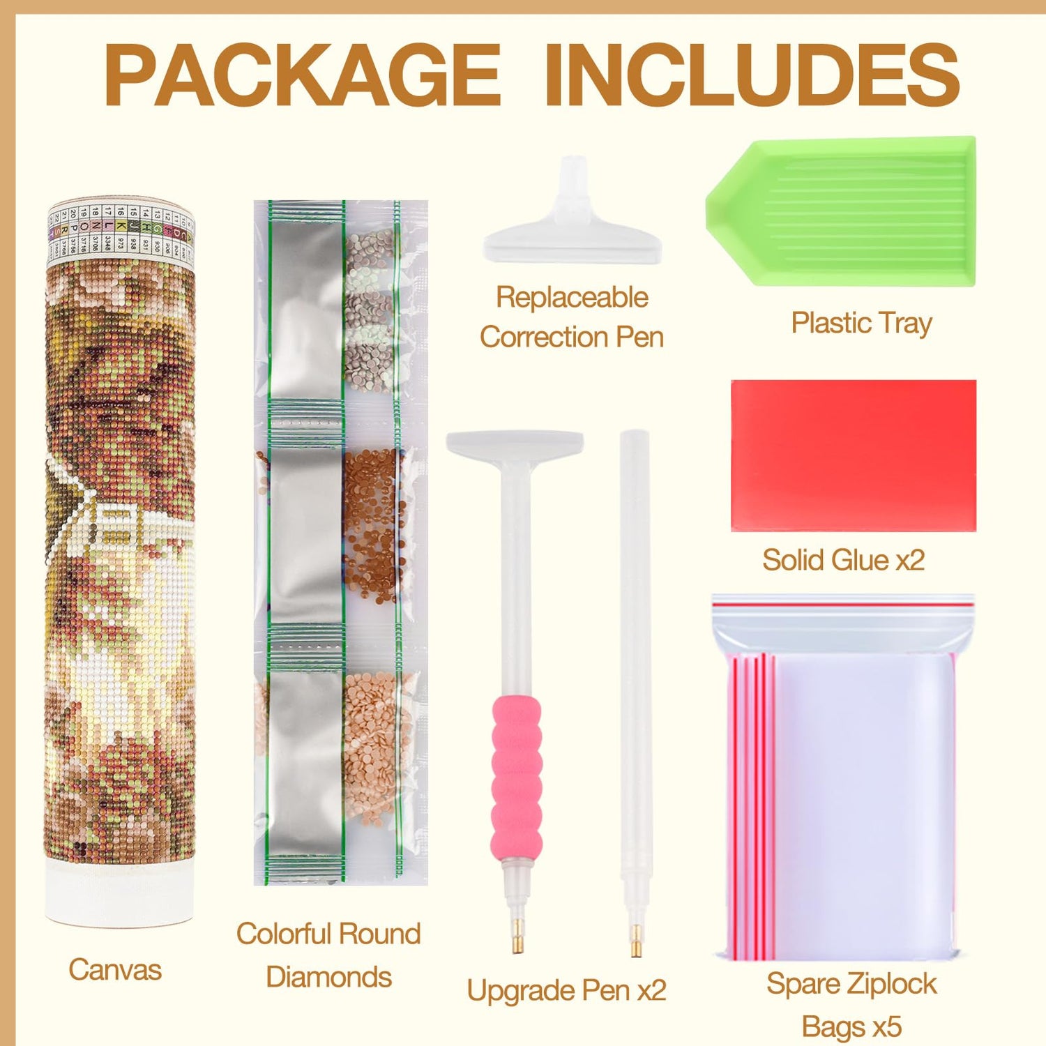 - DIAMOND PAINTING KIT INCLUDES: Each Diamond Painting comes with all the tools needed, you will receive the following tools 1x canvas, 2x diamond pens, 1x diamond tray, 1x glue clay, 1x replaceablecorrection pen, 5x ziplock bags for diamonds and enough colorful diamonds to start your wonderful DIY experience