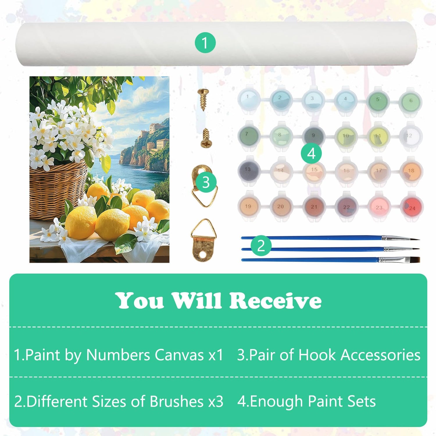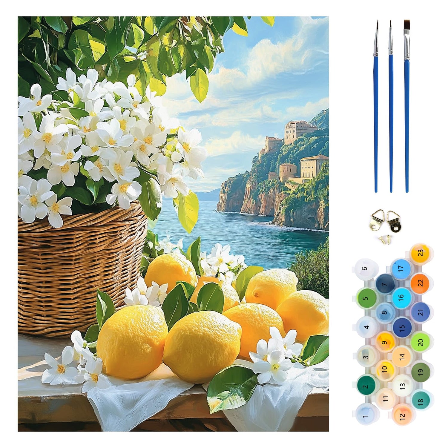 MEIYUDA Lemon Paint by Numbers Kit, Seascape Paint by Numbers for Adults Beginners, Lemon Flowers DIY Acrylic Oil Painting by Number on Canvas for Gift Home Wall Decor 12x16in